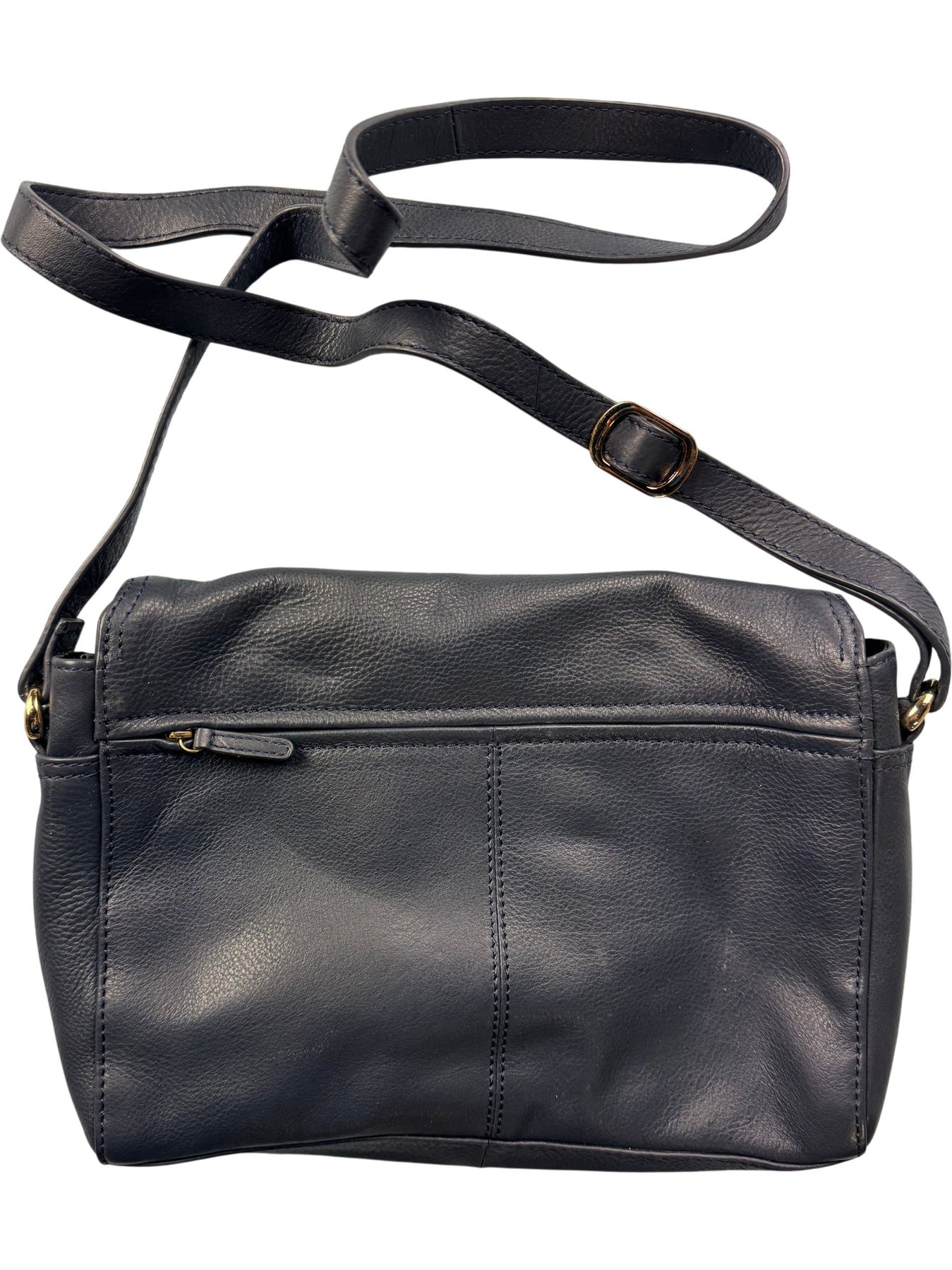 Black leather crossbody bag with a flap closure and gold-tone hardware. Features an adjustable strap and an exterior zip pocket. Interior includes a patterned fabric lining with a zip pocket.