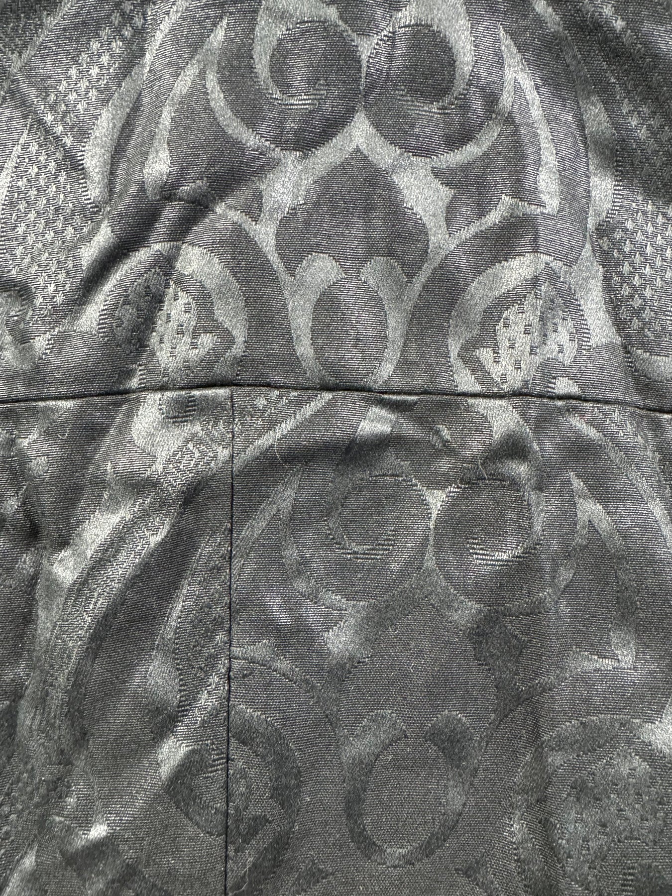 Black jacket with textured pattern and button-up front. Features long sleeves with button cuffs and decorative eyelets. Made from a shiny, patterned fabric.
