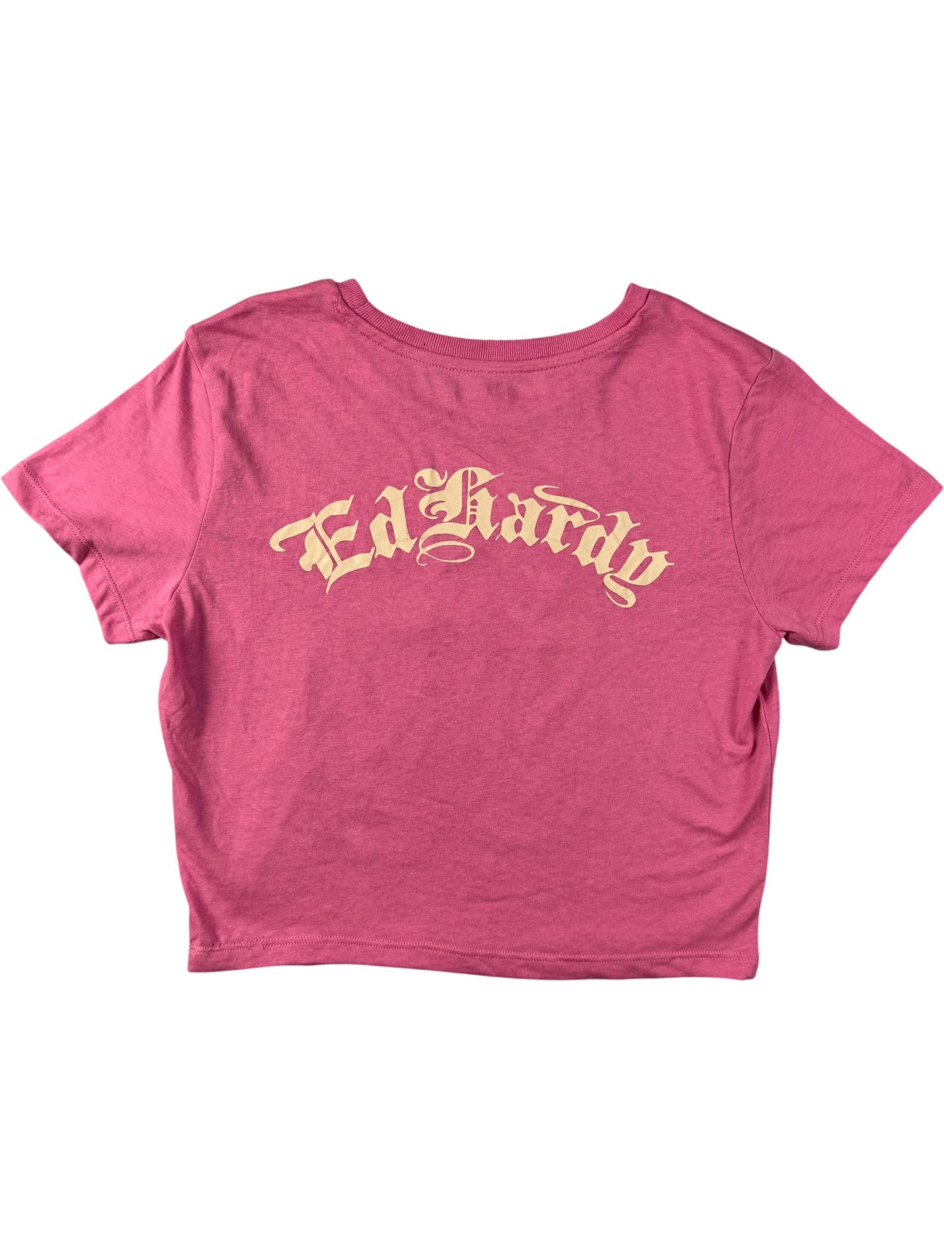 Pink T-shirt featuring a bold tattoo-style graphic on the front. Ed Hardy logo prominently displayed. Short sleeves with crew neckline.
