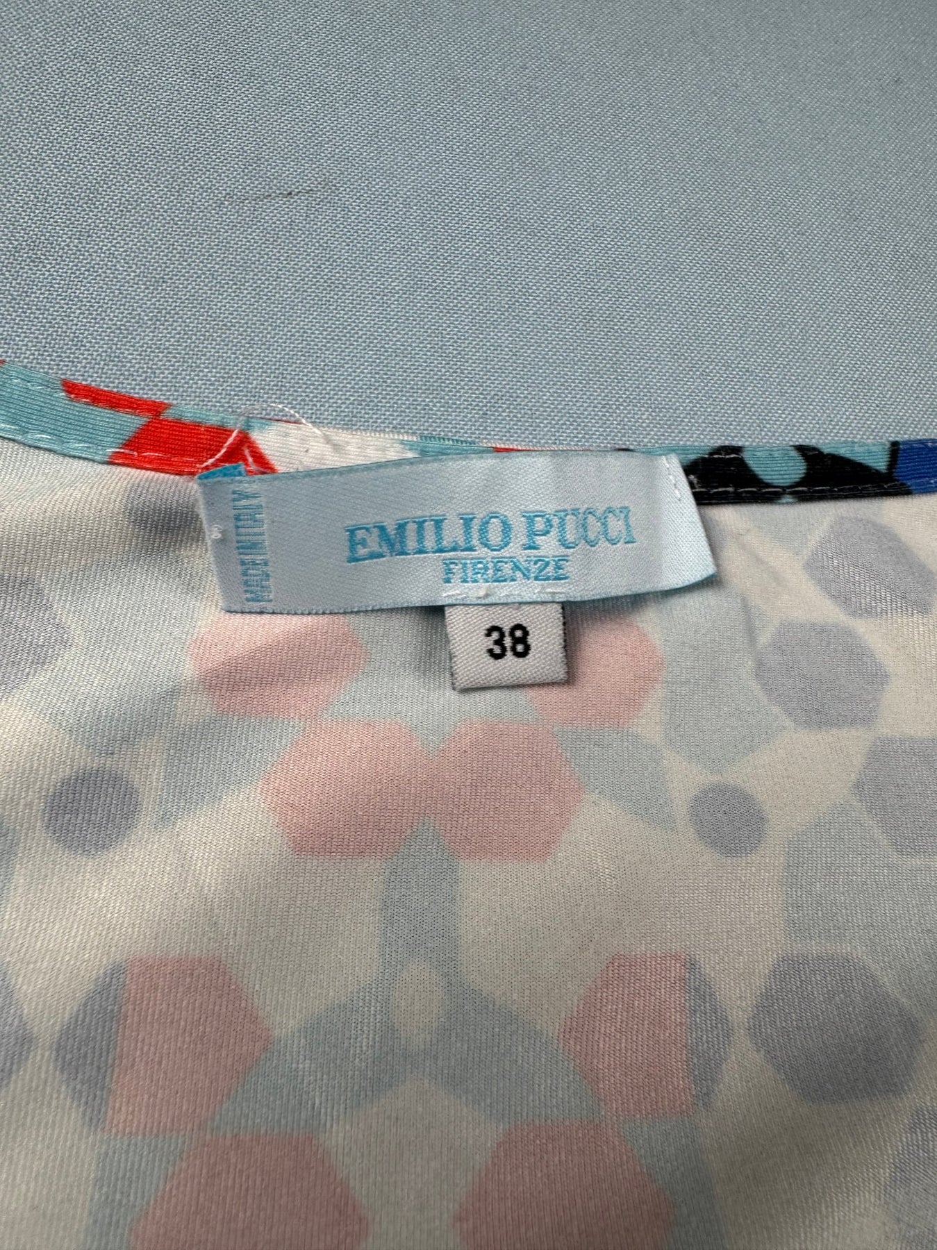 Emilio Pucci dress with geometric multicolor pattern. Features long sleeves and a V-neckline. Made from a comfortable fabric blend.