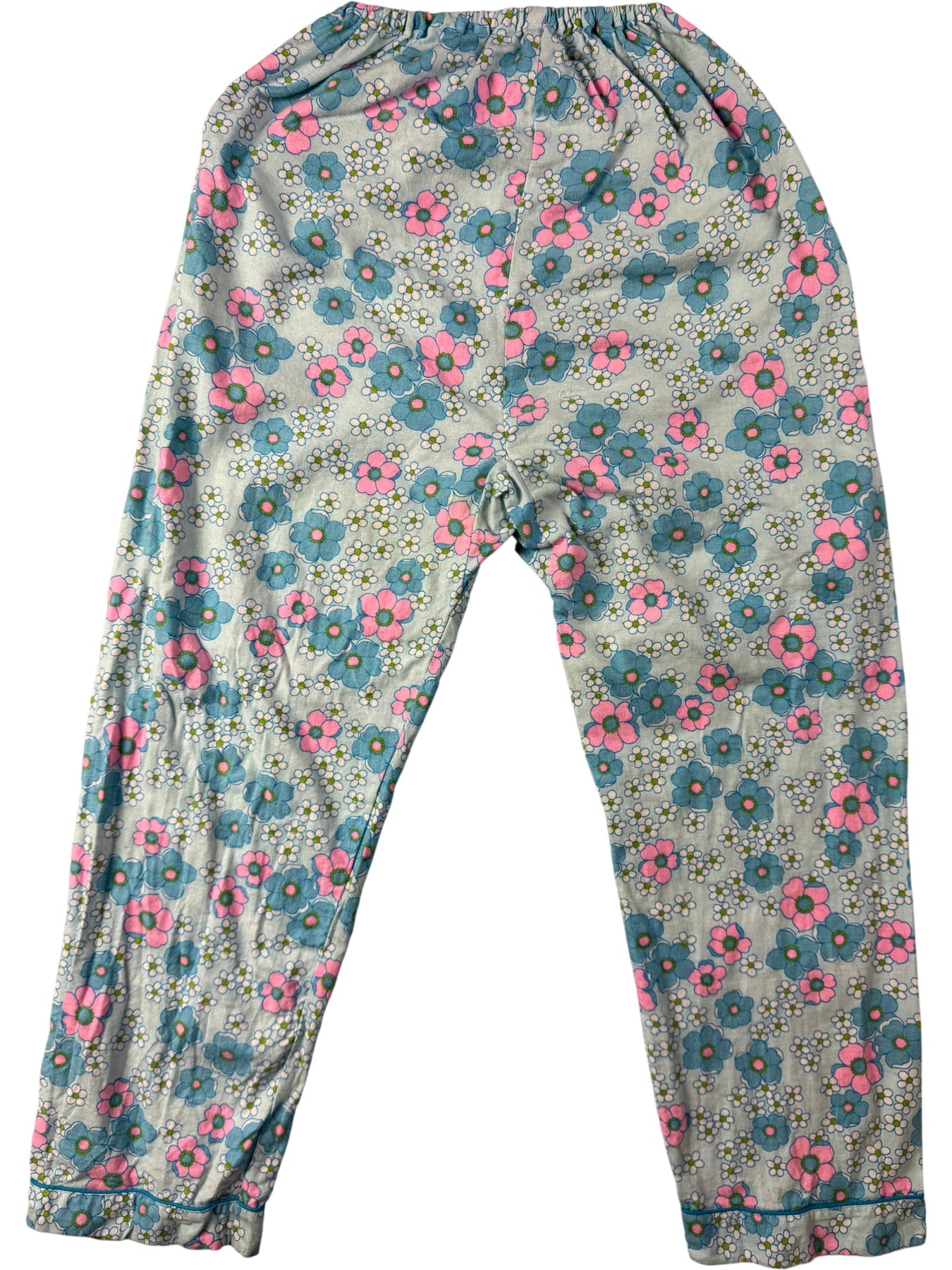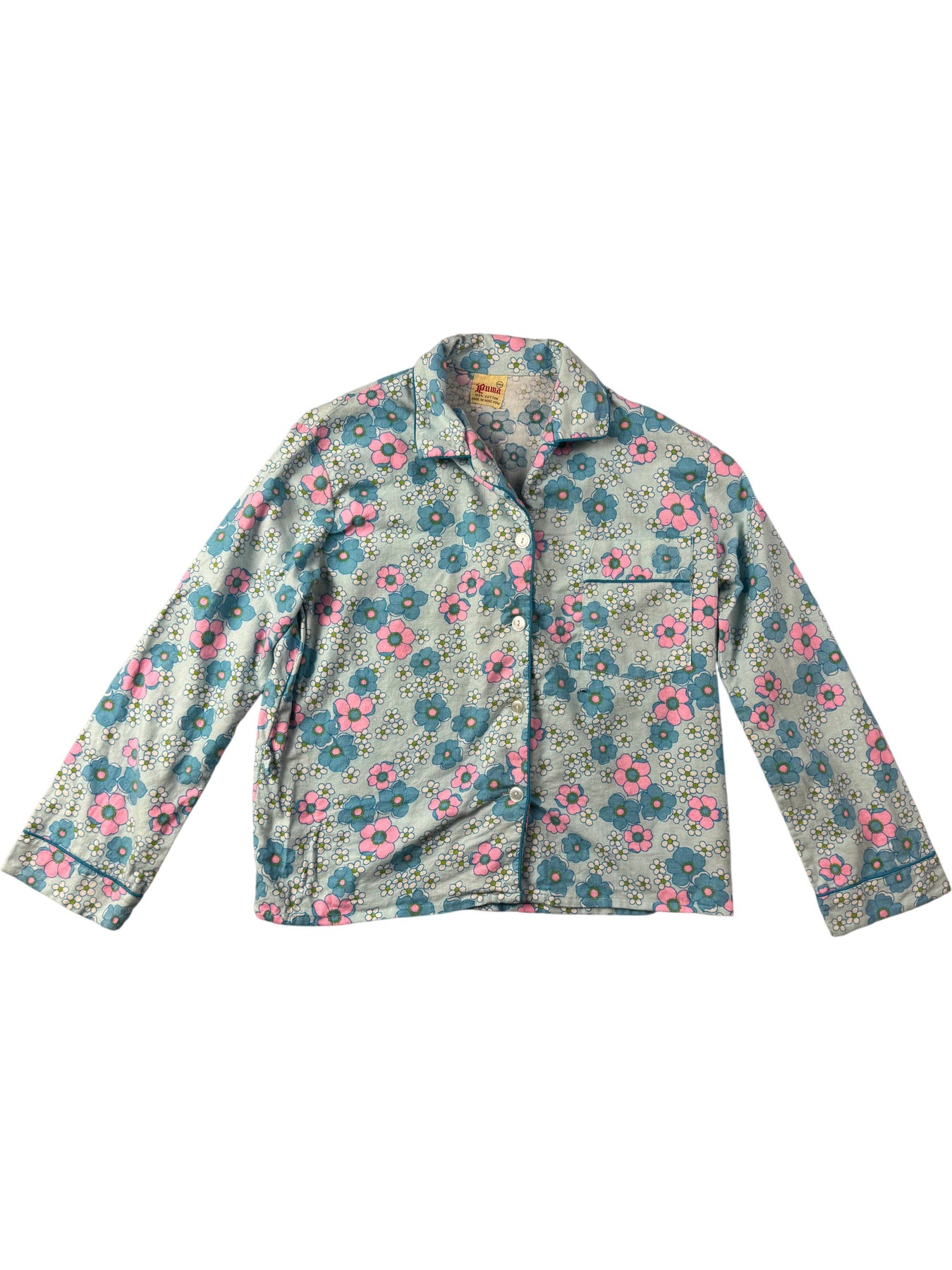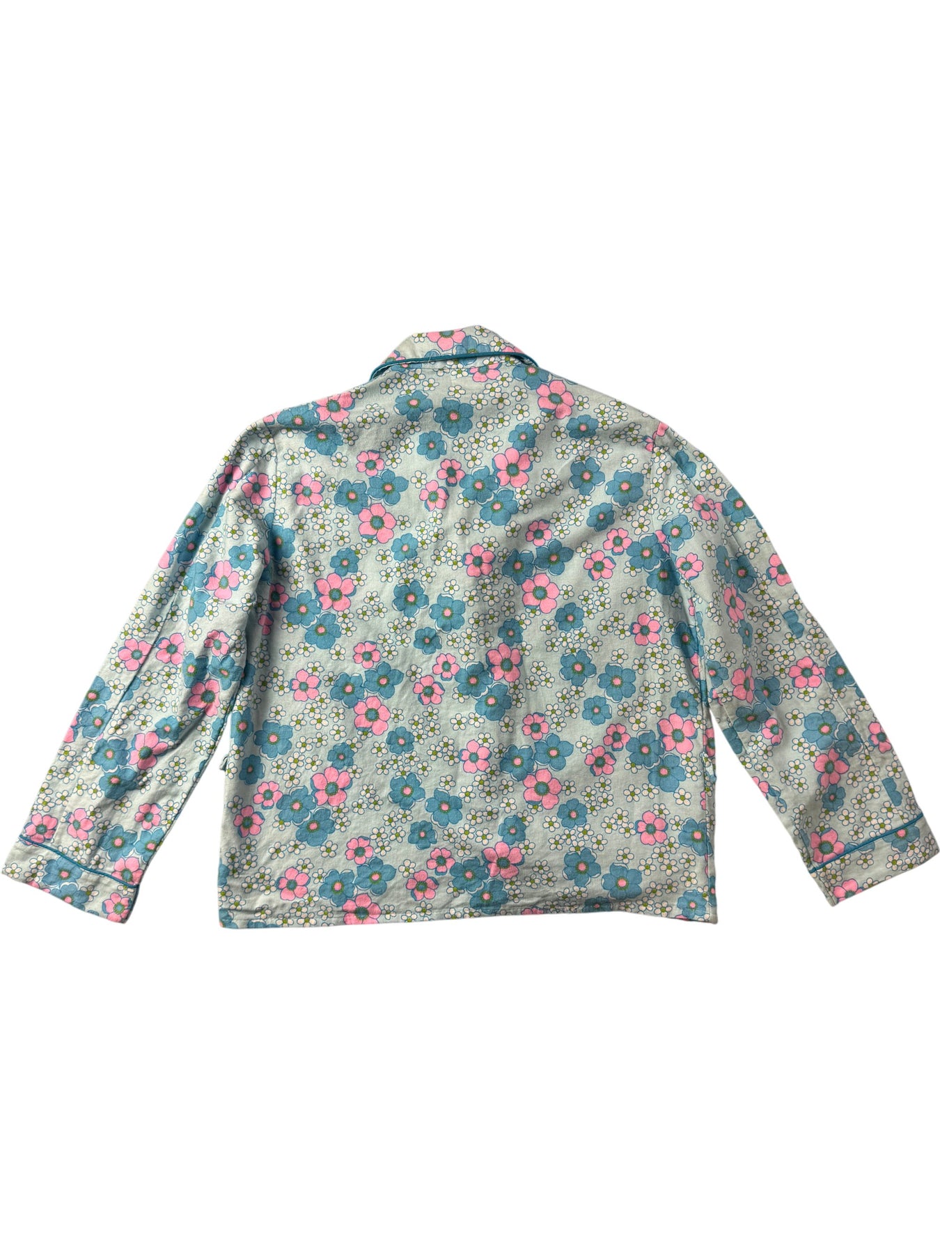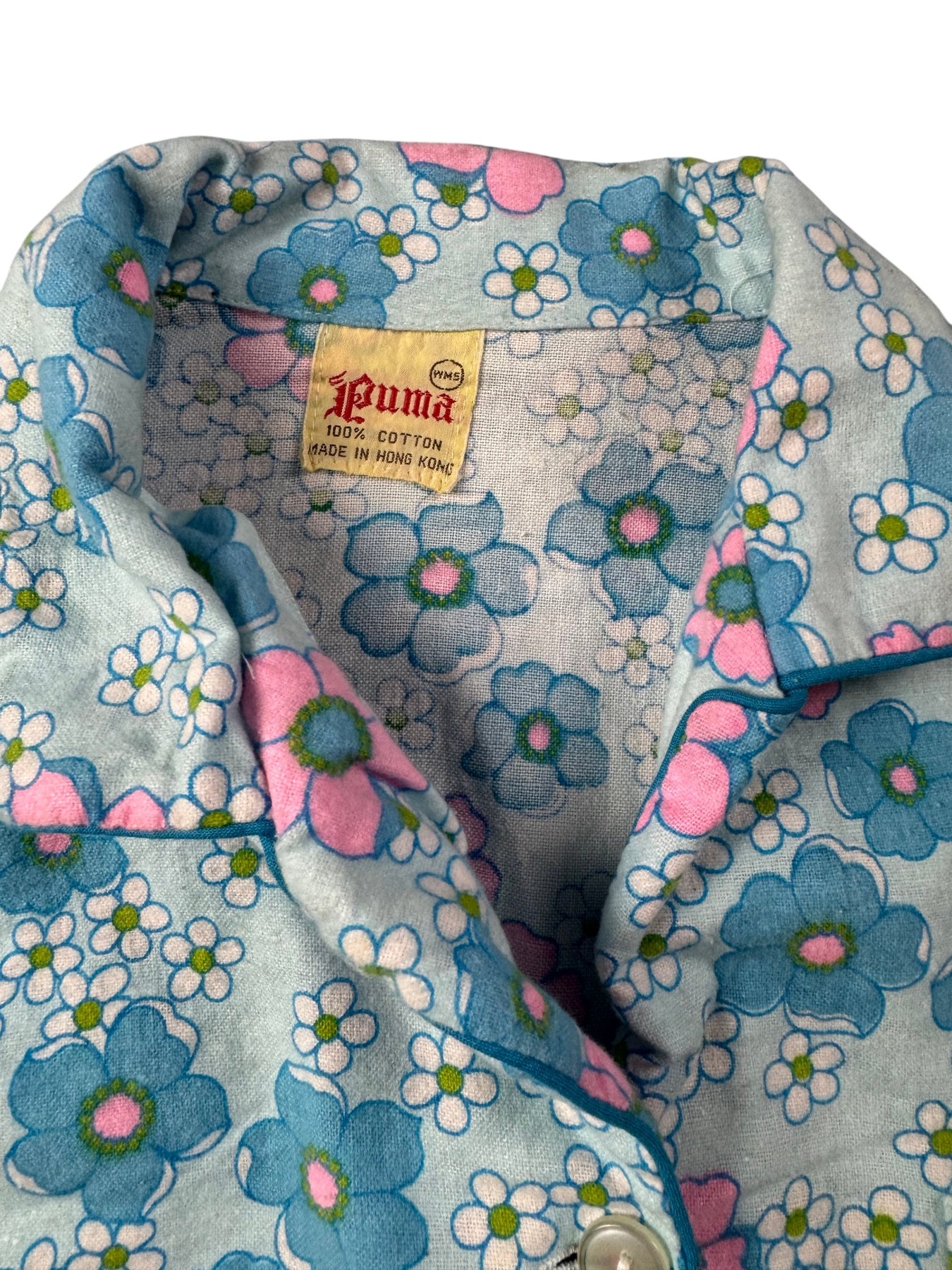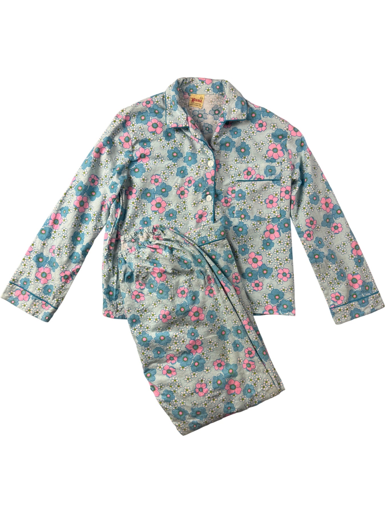 Floral patterned pajama set made from 100% cotton. Includes a long-sleeve button-up top with a front pocket and matching pants with an elastic waistband. Made in Hong Kong.