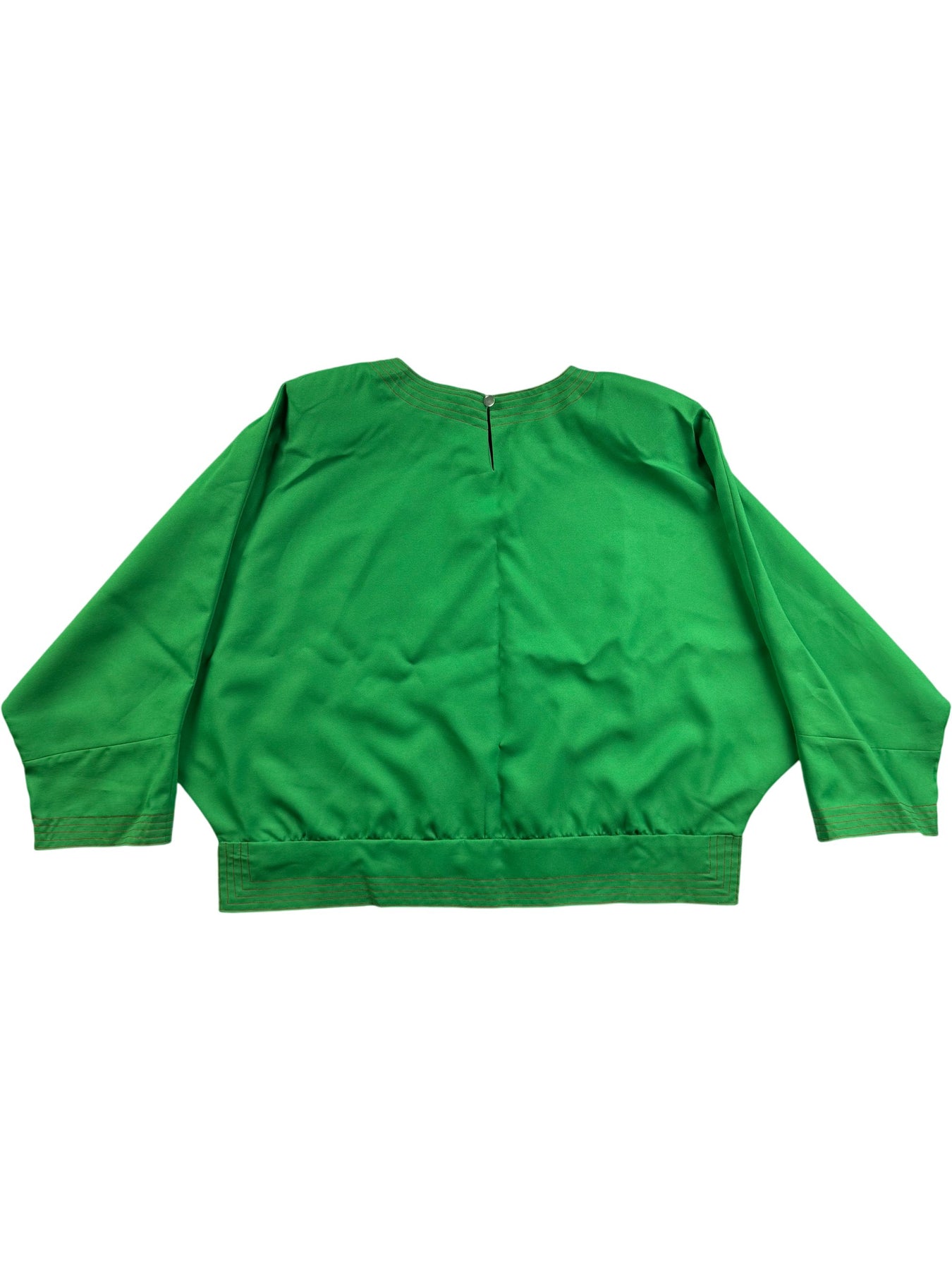 Batwing top with long sleeves. Crew neck design with simple back button closure. Made from a smooth, lightweight fabric.