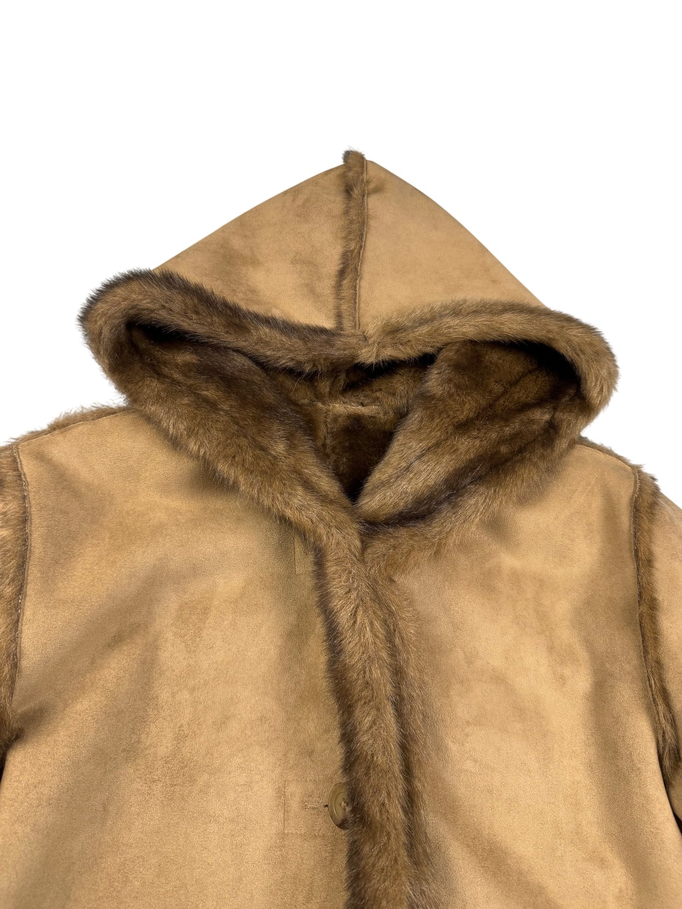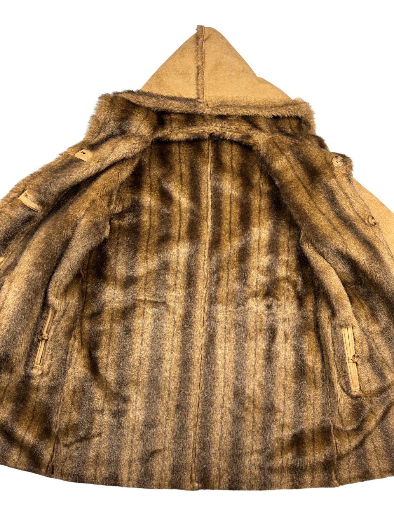 Tan coat with hood and faux fur trim. Features two front pockets with faux fur lining. Fur lining extends throughout the interior, providing additional warmth.