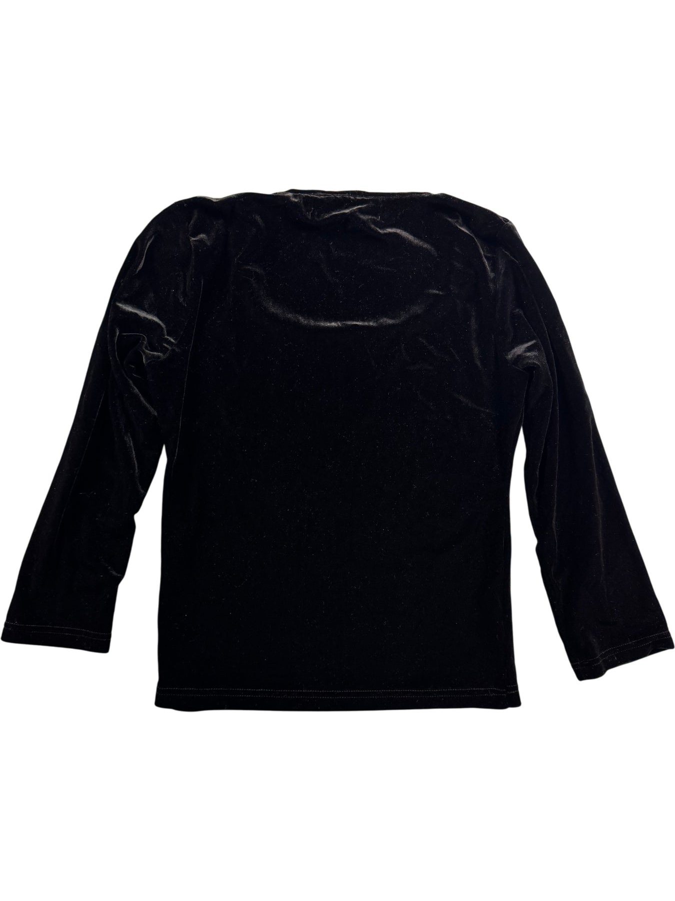 Black velvet top featuring a square neckline and long sleeves. Made of 90% polyester and 10% elastane. Embroidered branding on the front.