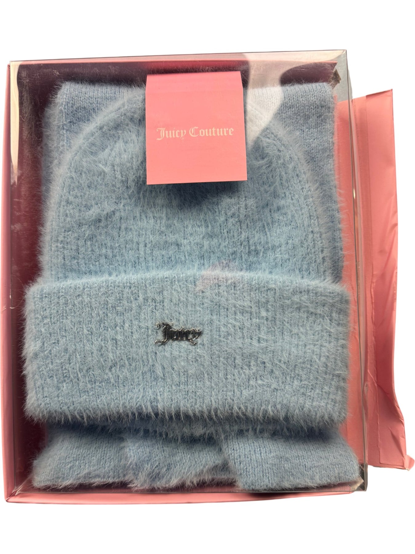 Light blue beanie and scarf with Juicy Couture branding. Made from soft, fluffy material. Includes matching gloves in the set.