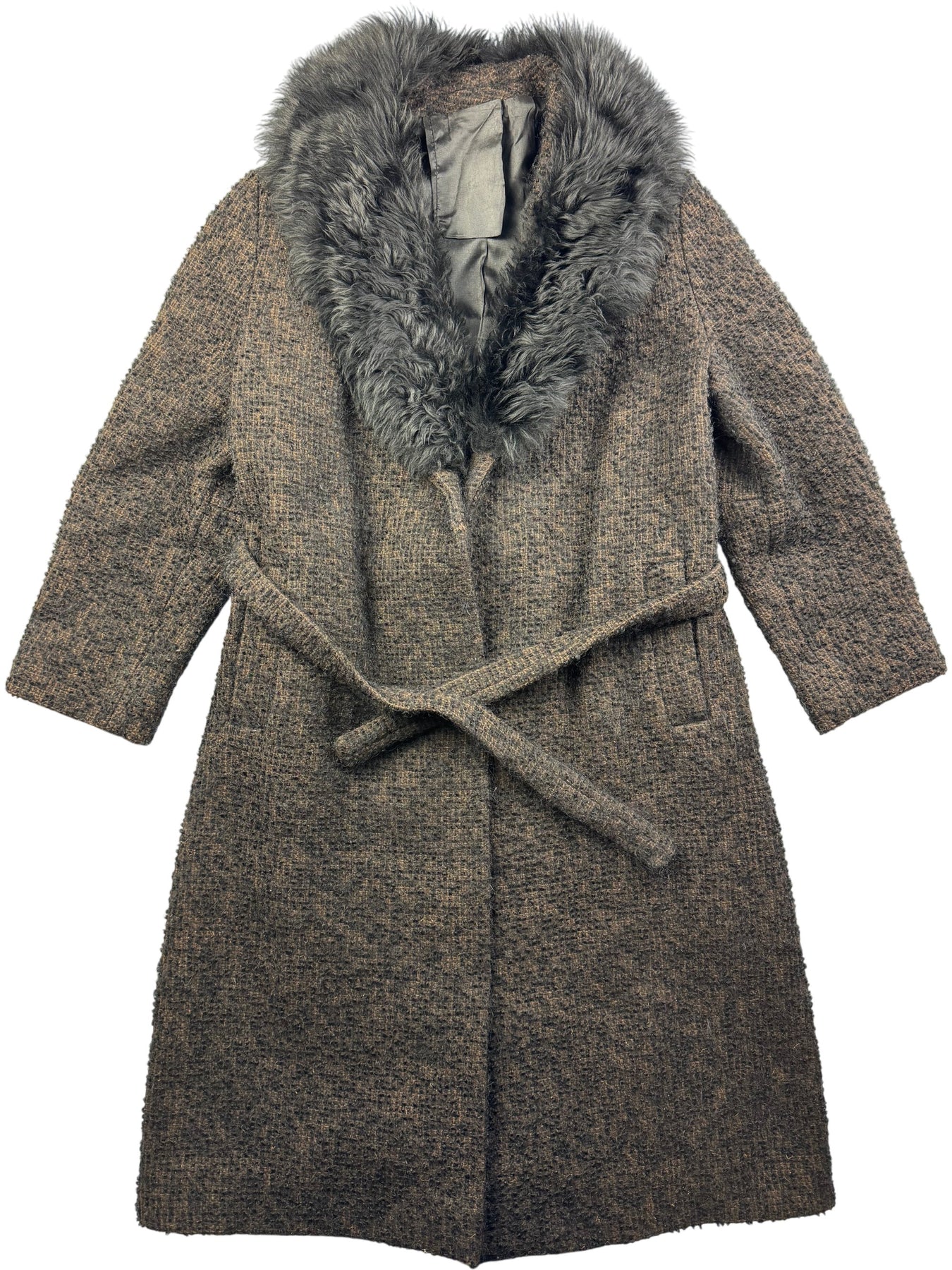 Brown textured coat with a faux fur collar. Belted waist for adjustable fit. Side pockets for convenience.
