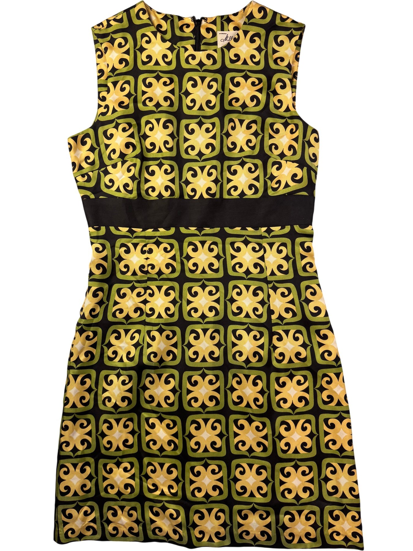 Milly New York dress featuring a geometric pattern with black and yellow hues. Made from 100% silk with an acetate lining. Sleeveless design with a mini length.