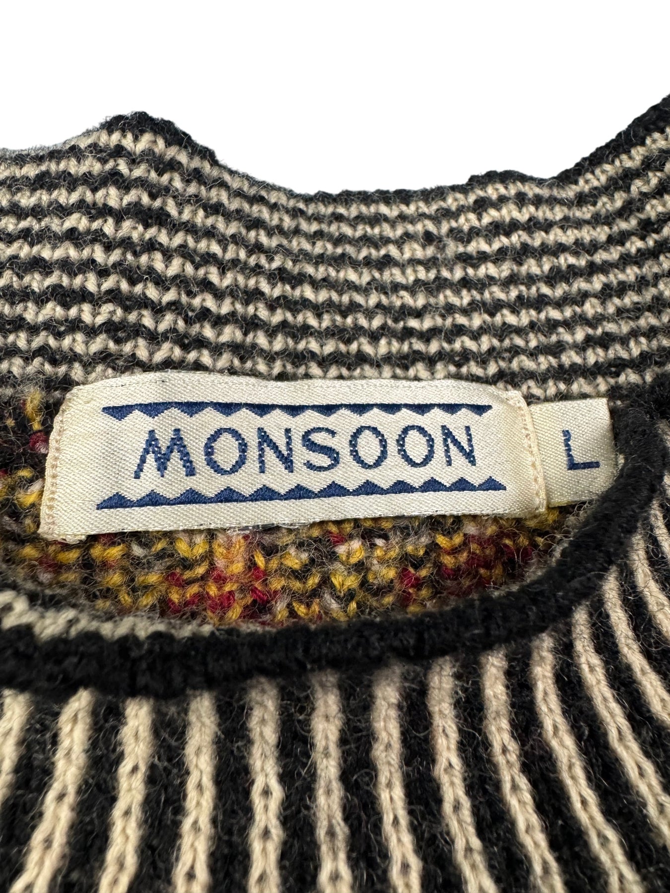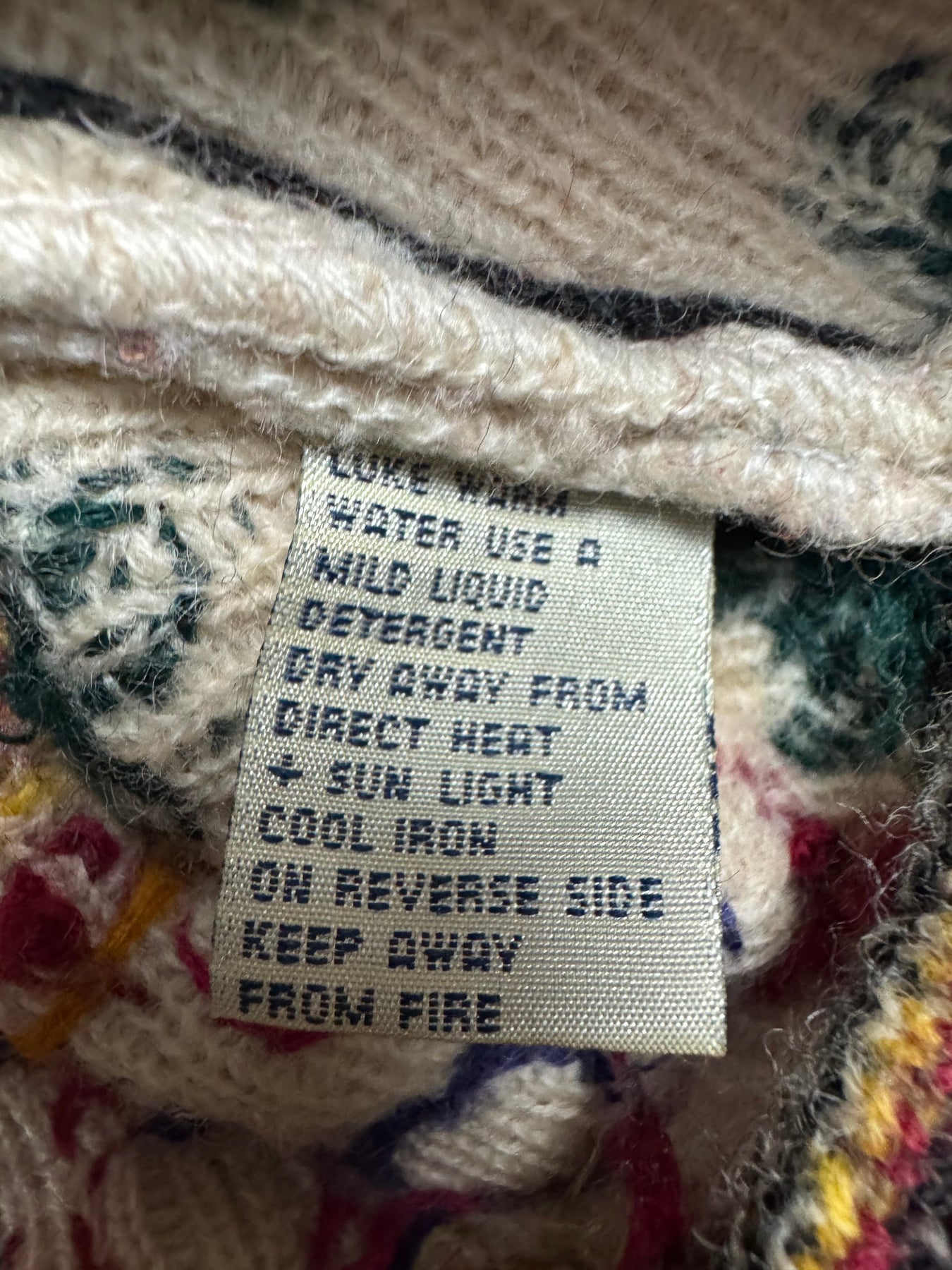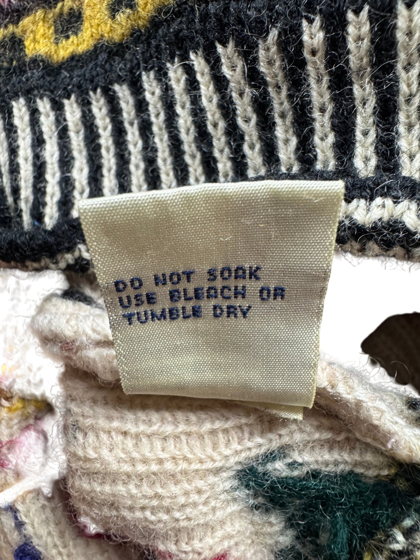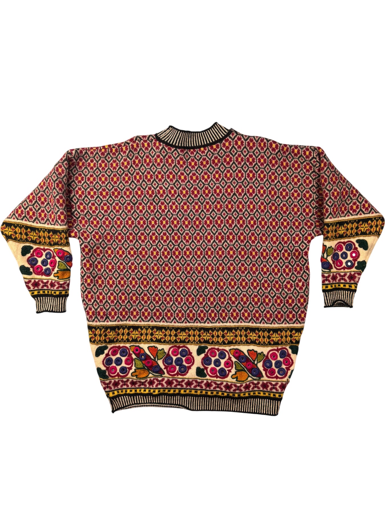 This sweater features a bold geometric and floral pattern with vibrant colours. It has a crew neckline and ribbed cuffs and hem for added style.