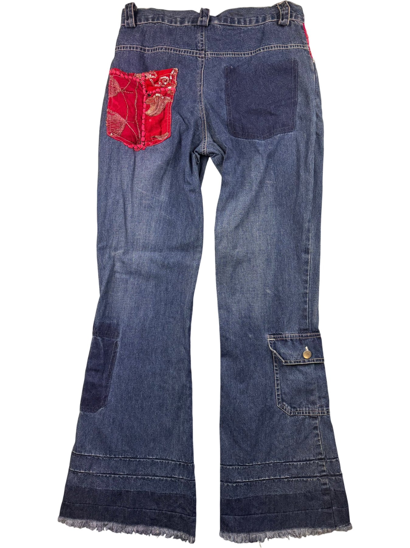 Flared denim jeans with a unique red patch detail on the front and back pockets. Made from 100% preshrunk cotton for comfort and durability. Features additional side pocket and frayed hems. Made in Nepal.