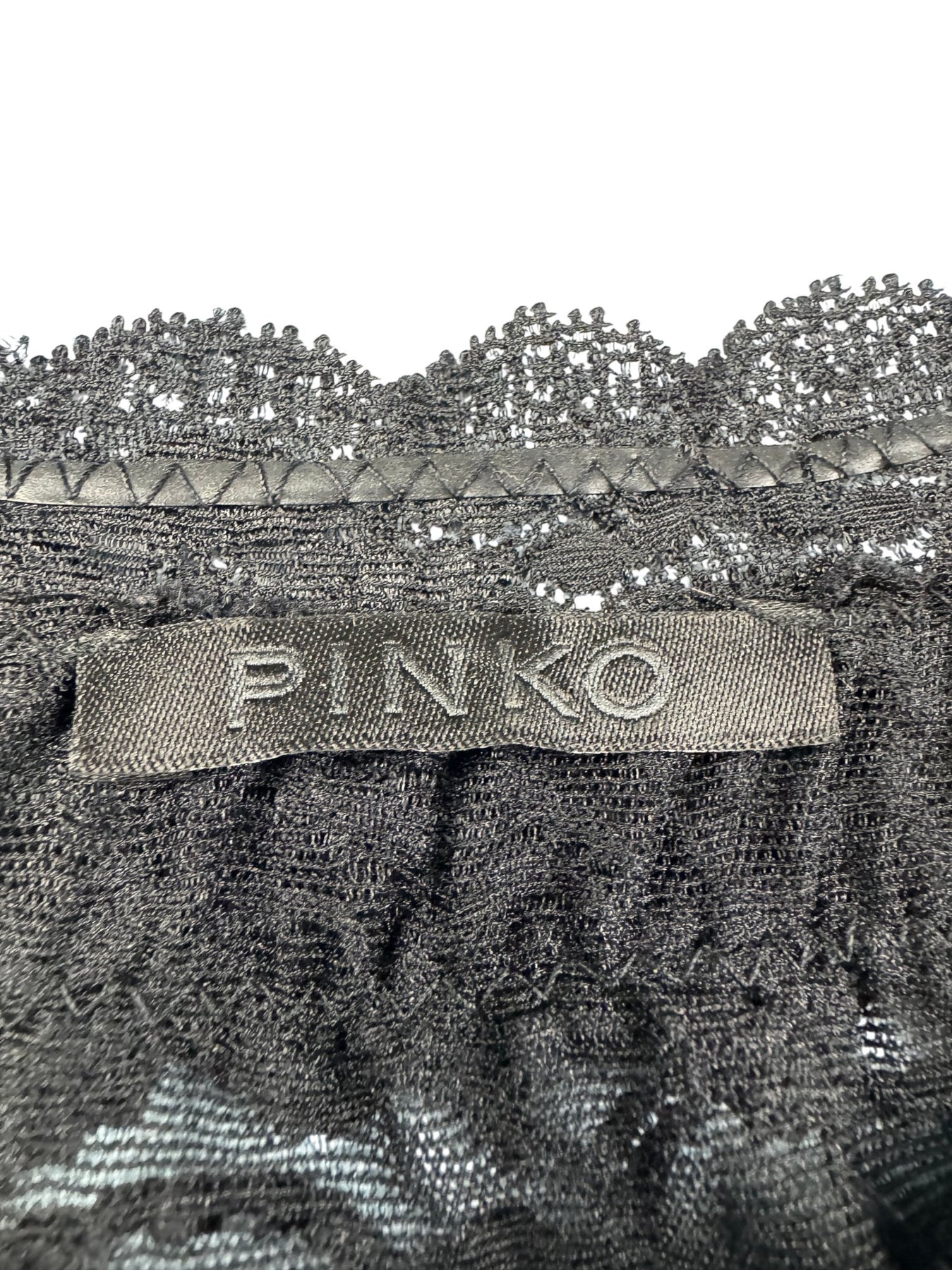Elegant black lace dress with intricate floral patterns and a fitted design. Features a scalloped neckline and three-quarter sleeves for a sophisticated look.