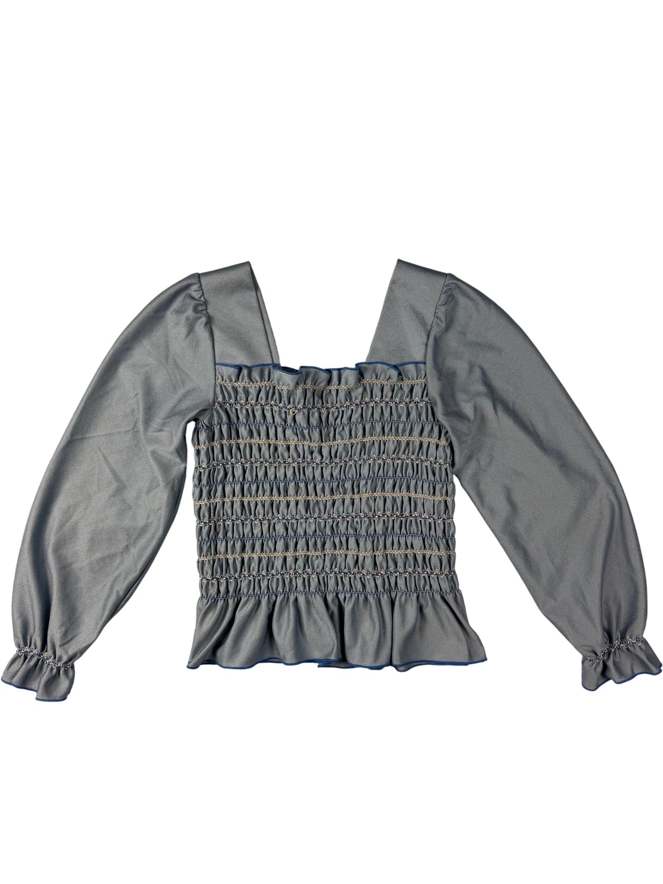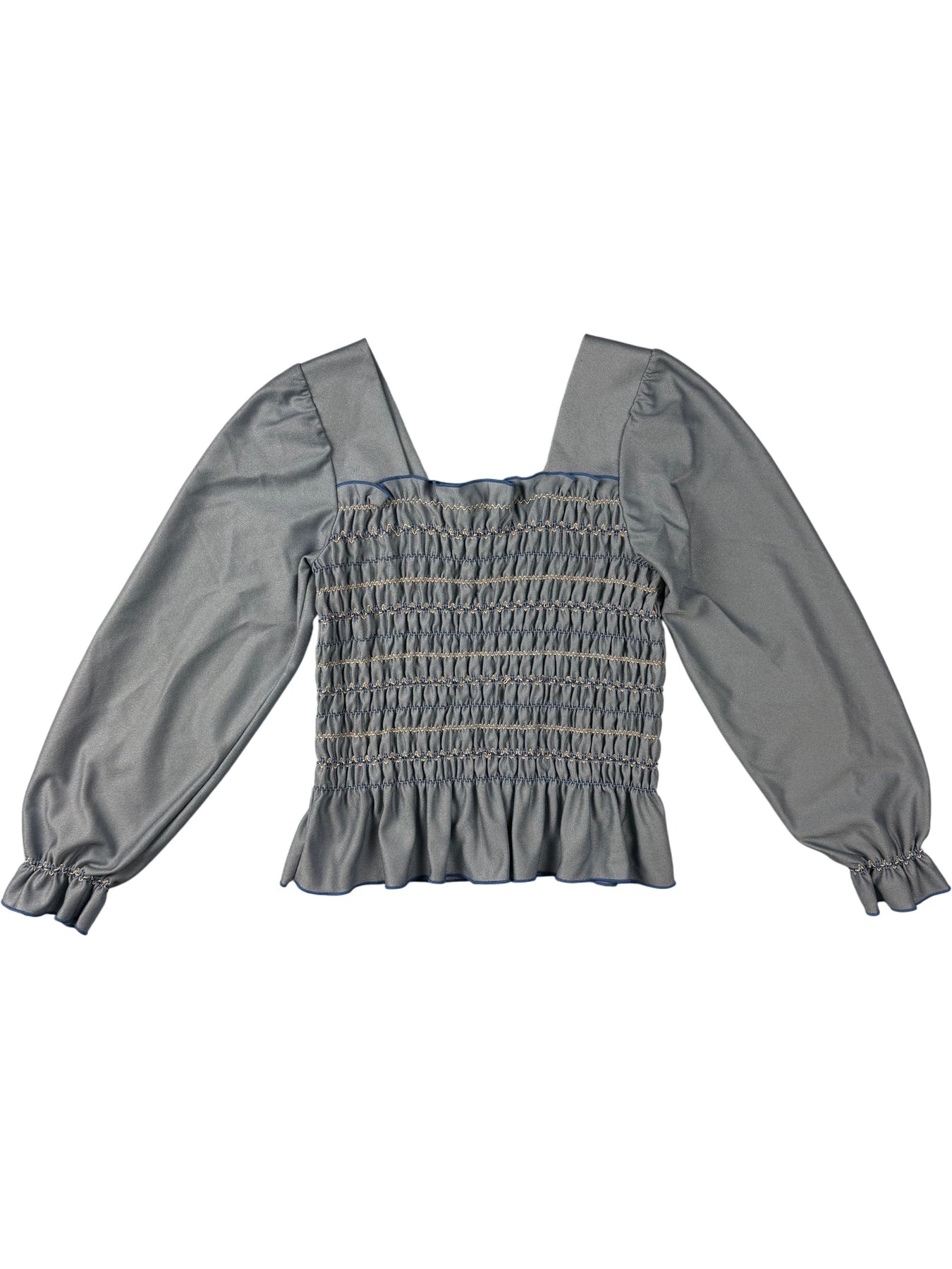 Blue blouse with long sleeves and smocked bodice. Made from 100% polyester. Features a ruffled hem and cuffs.