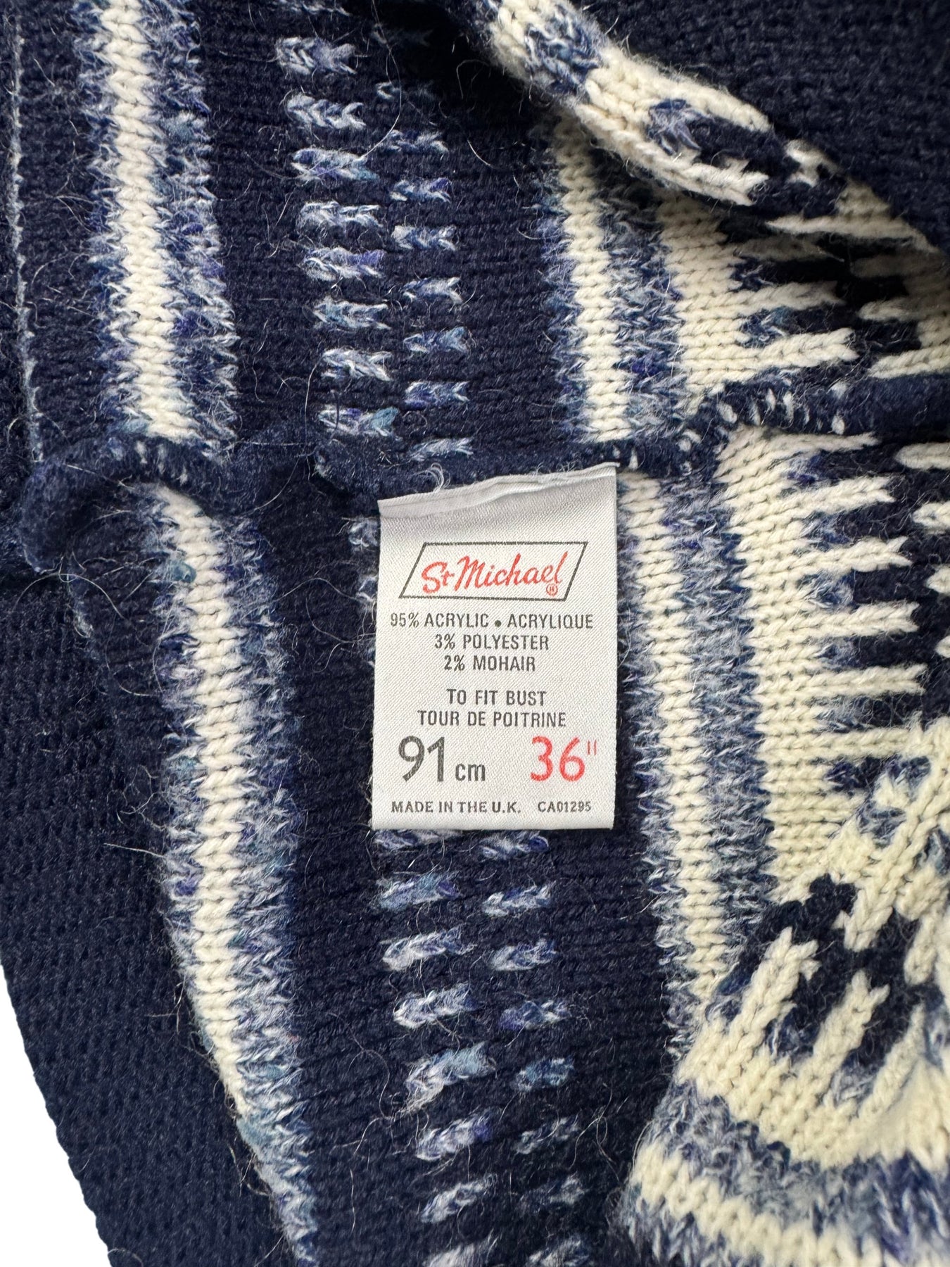 This long sleeve sweater features a striped pattern in a mix of dark and light shades. Made from 95% acrylic, 3% polyester, and 2% mohair, it offers comfort and durability. Manufactured in the UK.