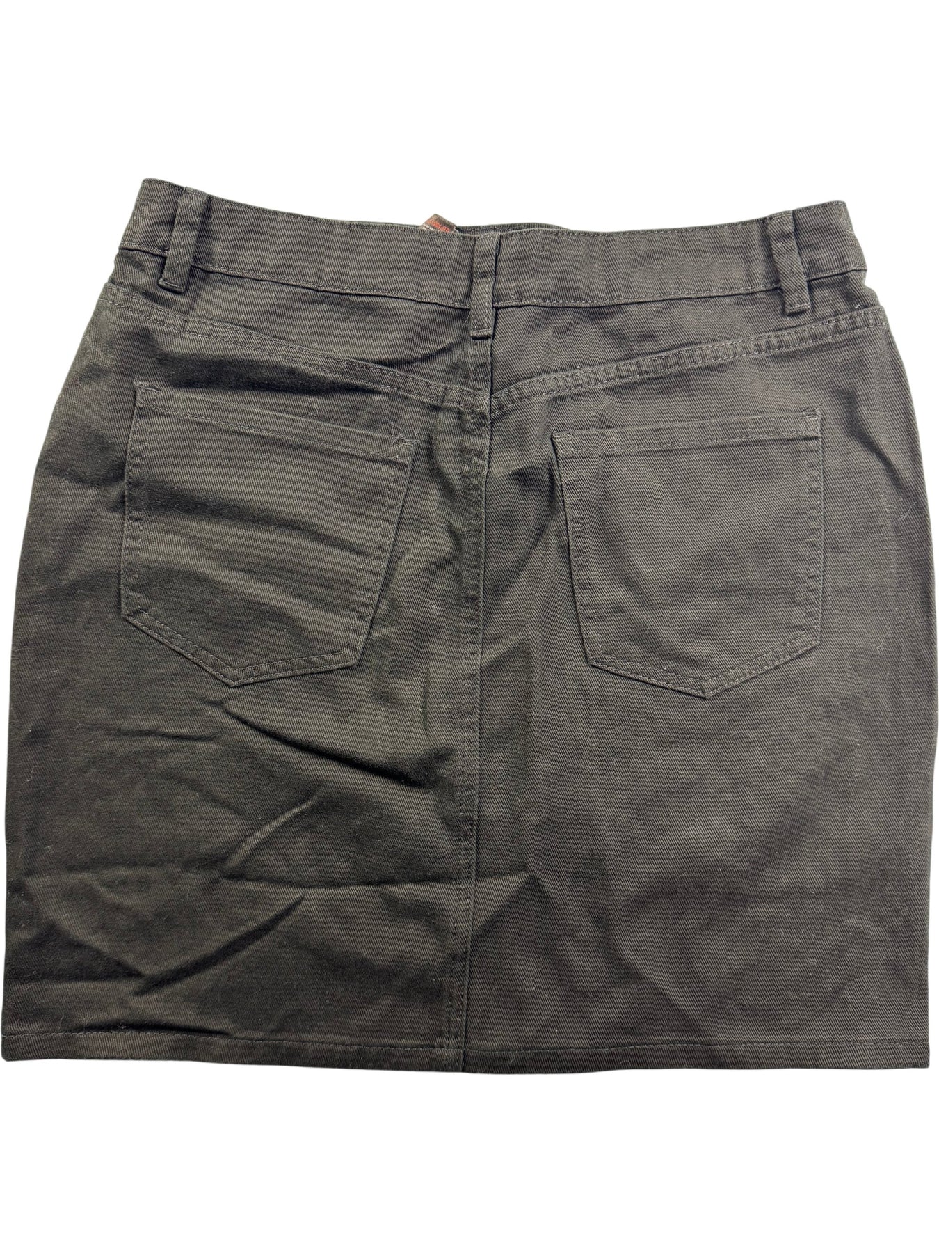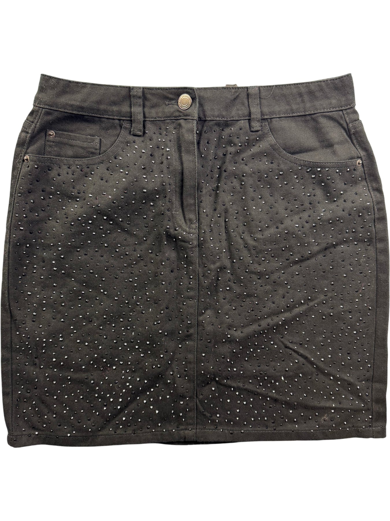 Black mini skirt with studded pattern on the front. Features two front pockets and two back pockets. Belt loops and front button closure.