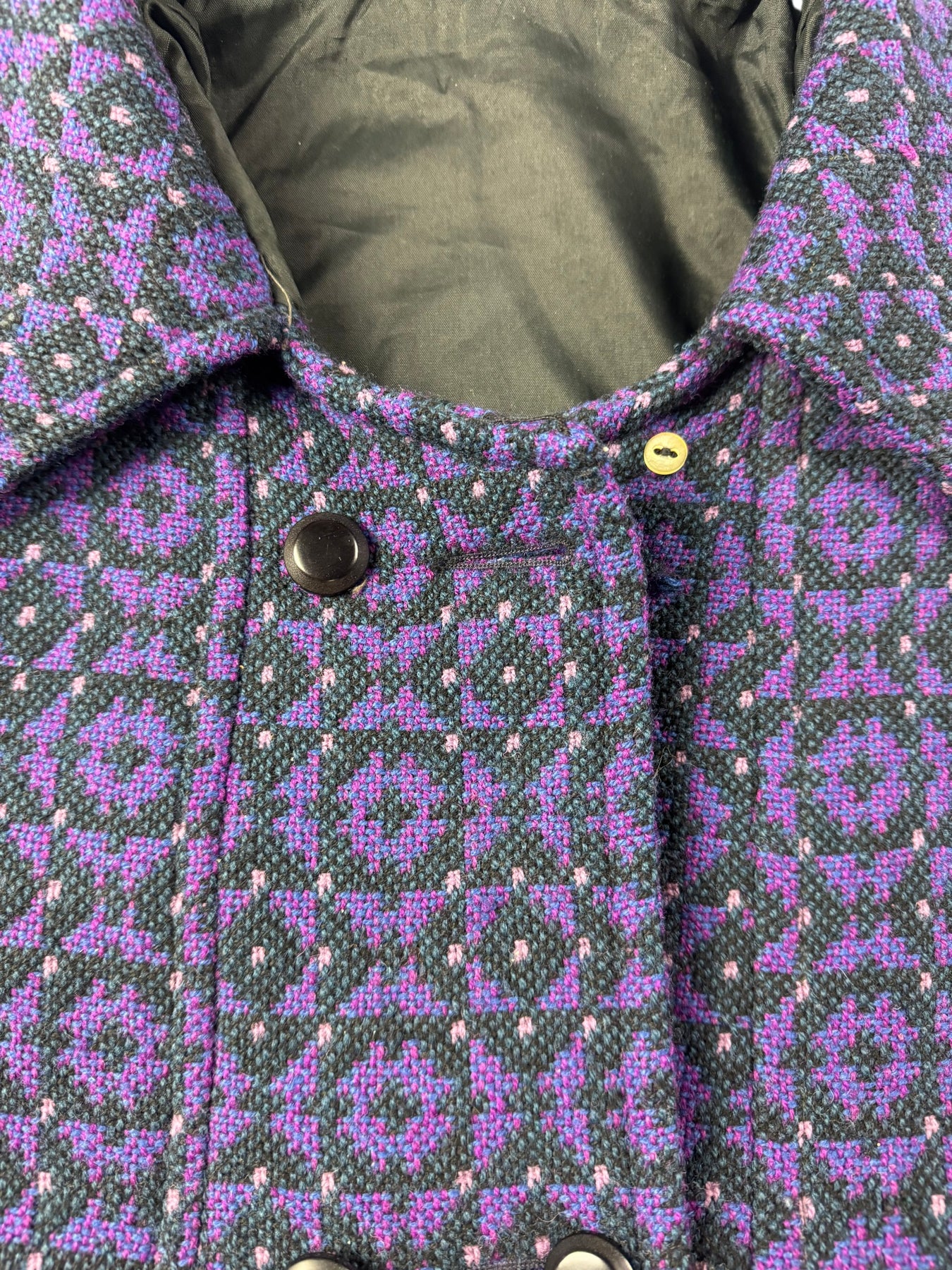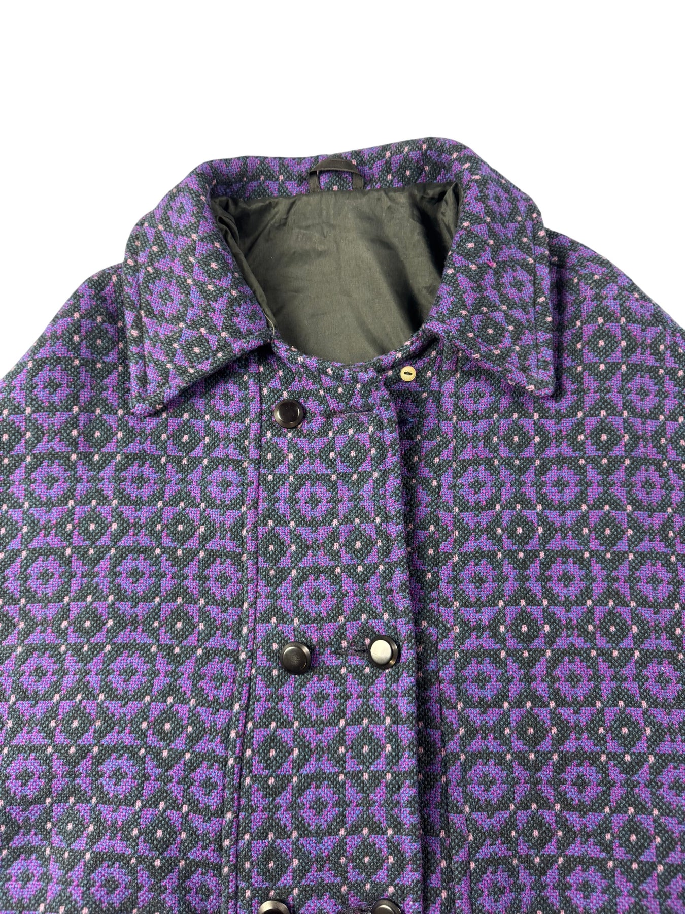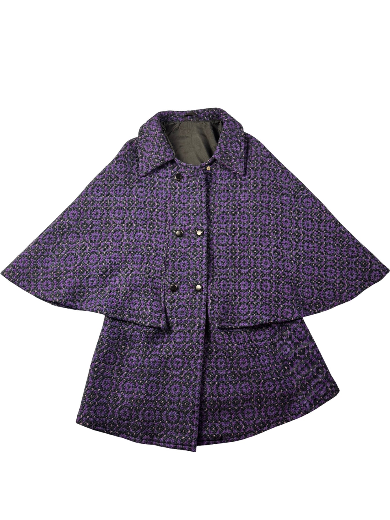 This cape features a purple geometric pattern and is constructed from pure new wool. It has a button closure and a lined interior for added comfort.