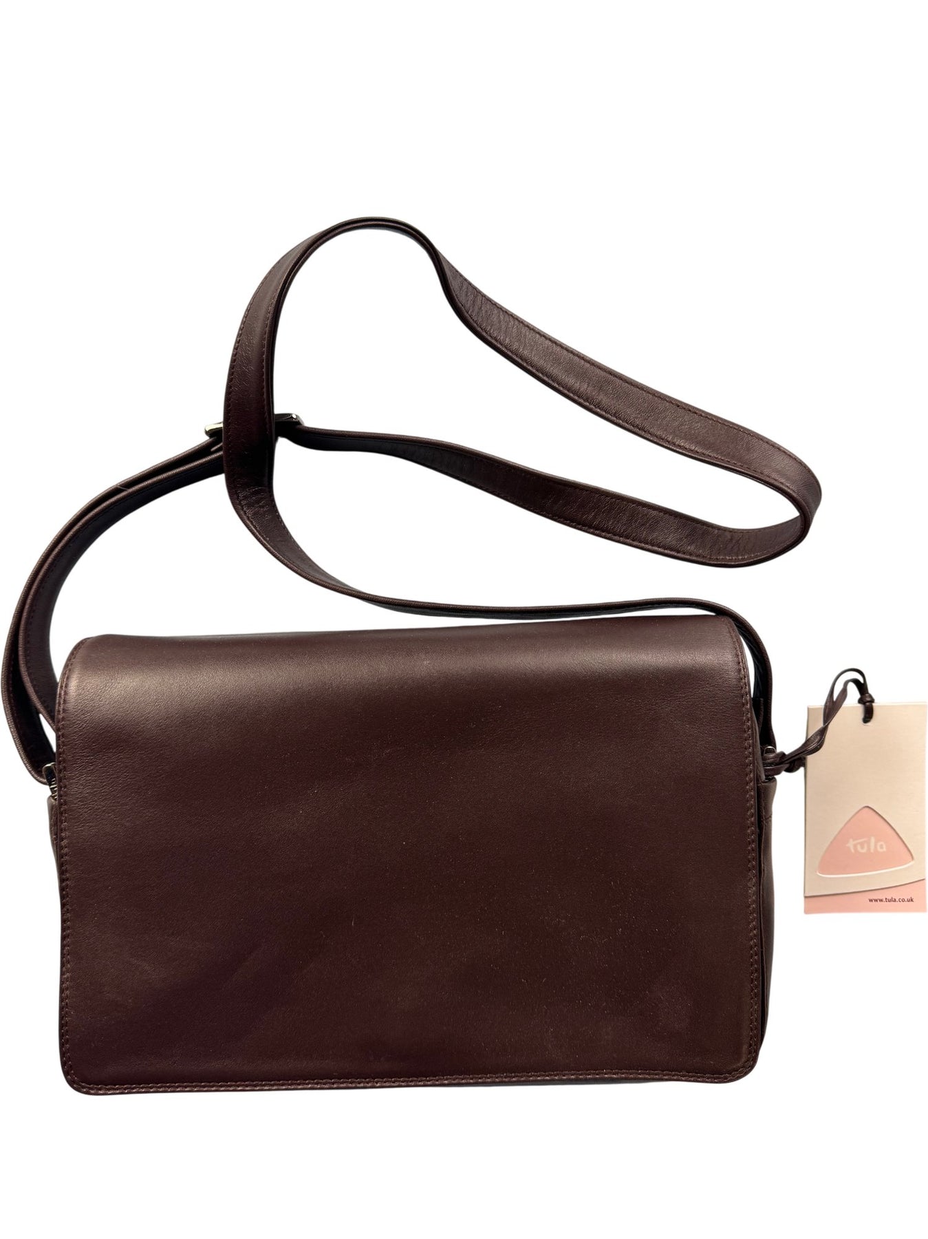 Brown leather crossbody bag from Tula with a flap closure. Features an adjustable strap and a zippered back pocket for additional storage.