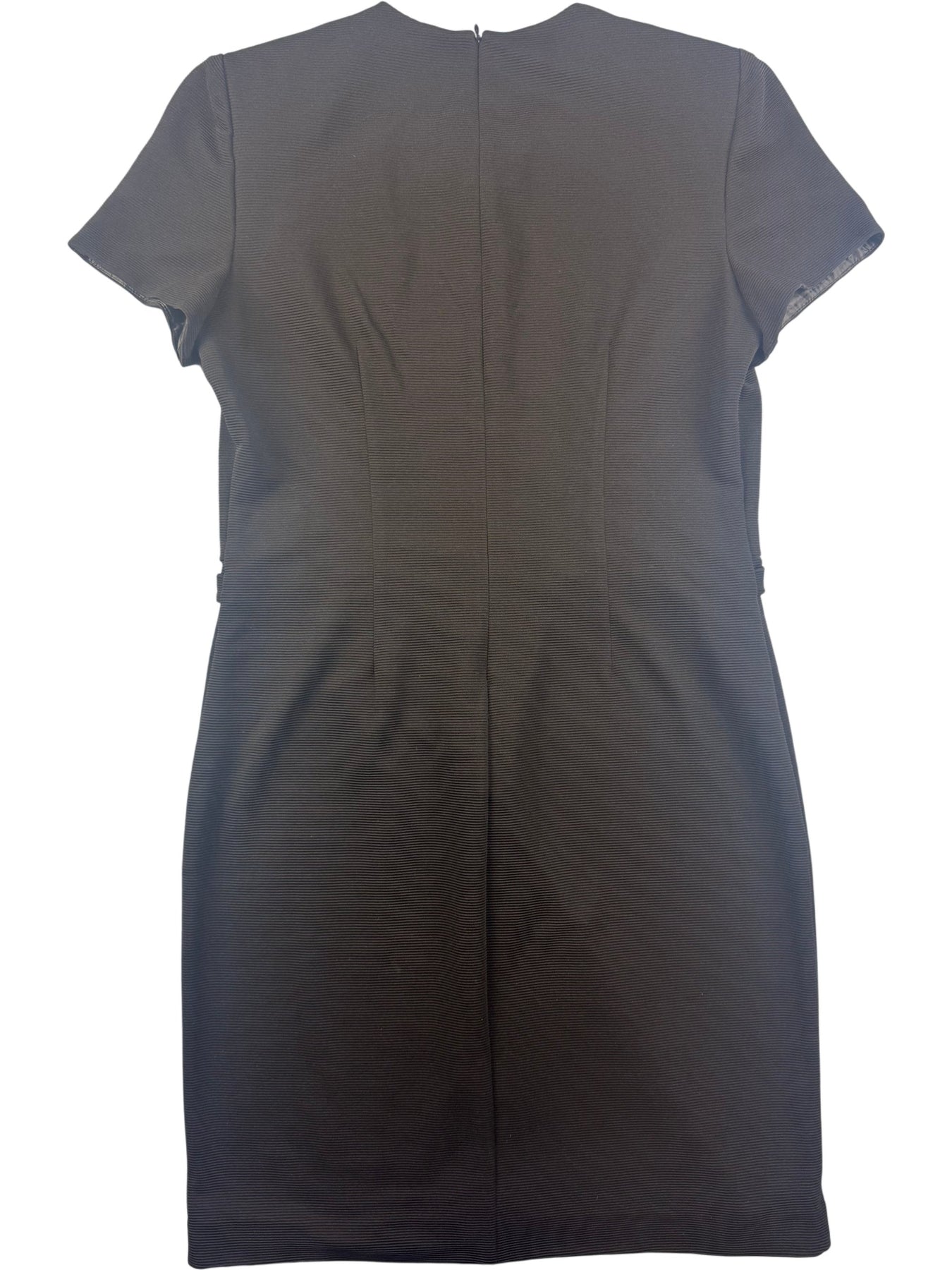 Short sleeved black dress by Virgo II featuring a round neckline and a belted waist with metal ring detail. Made from a blend of polyester, lycra, and rayon.