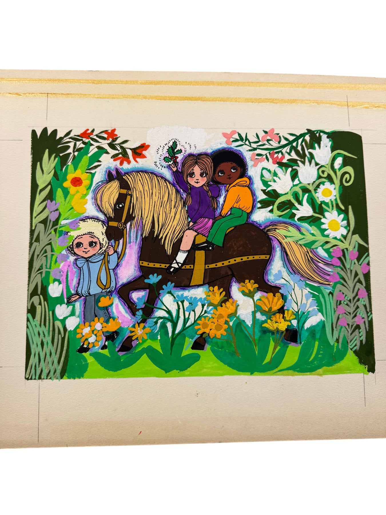 Children's illustration featuring two kids on a horse with vibrant floral background. Painted on high-quality Oram & Robinson watercolour board. Belinda Lyon Design