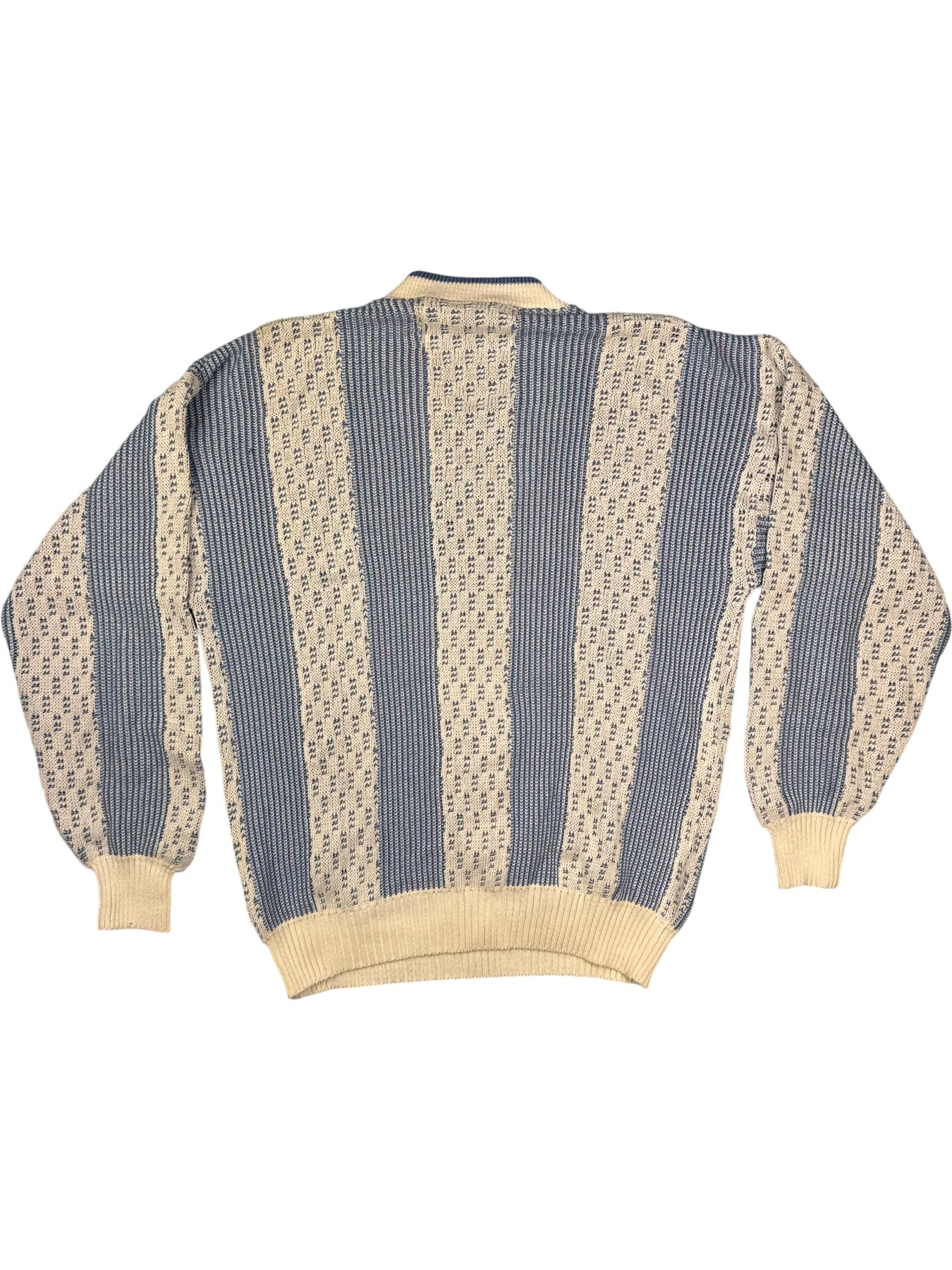 Striped blue and white V-neck sweater with a mix of 55% acrylic, 43% cotton, and 2% nylon. Includes ribbed cuffs and hem. Made in the UK.