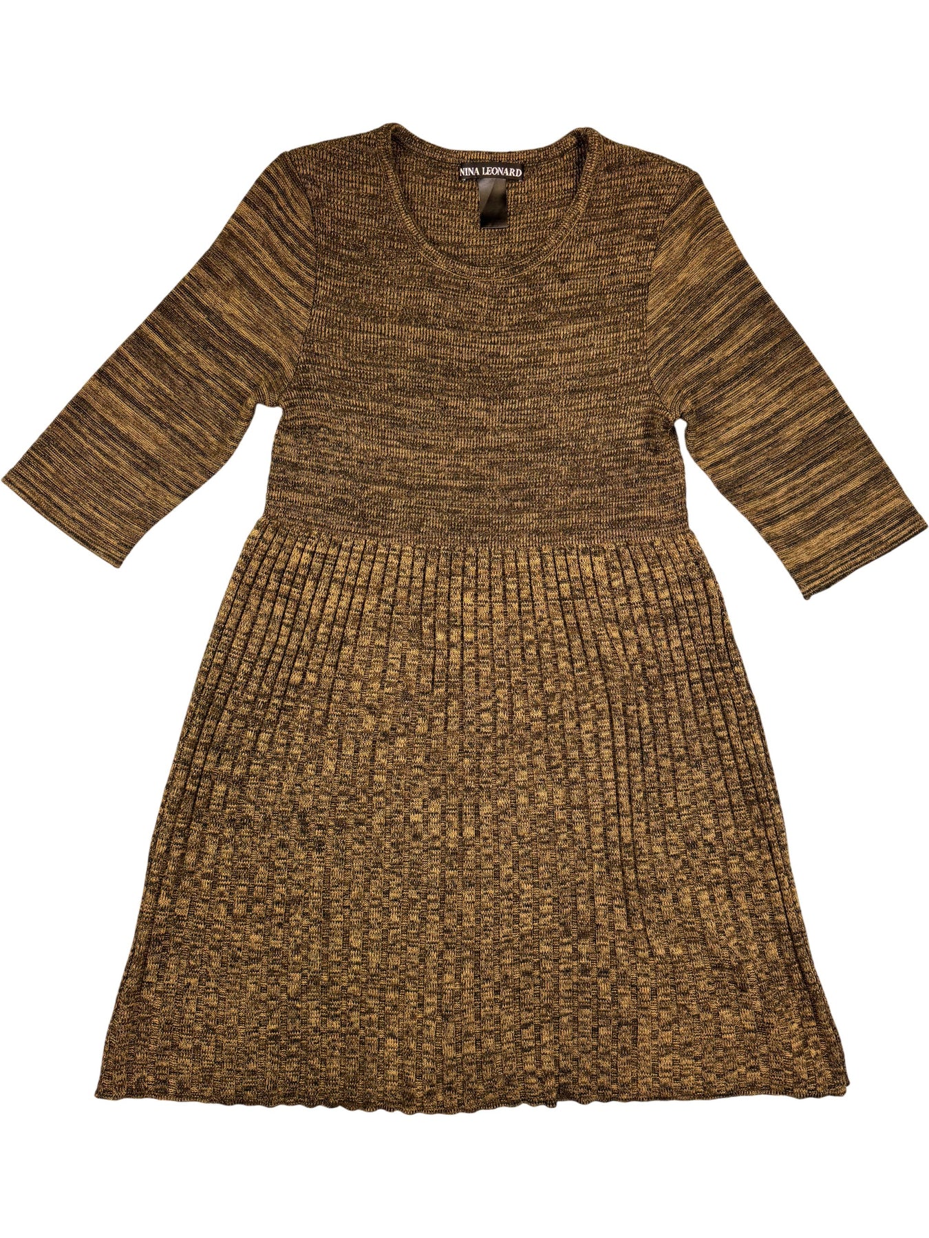 Knit dress featuring a brown hue with a marled pattern. It has three-quarter sleeves and a crew neckline. The skirt has a pleated texture for added style.