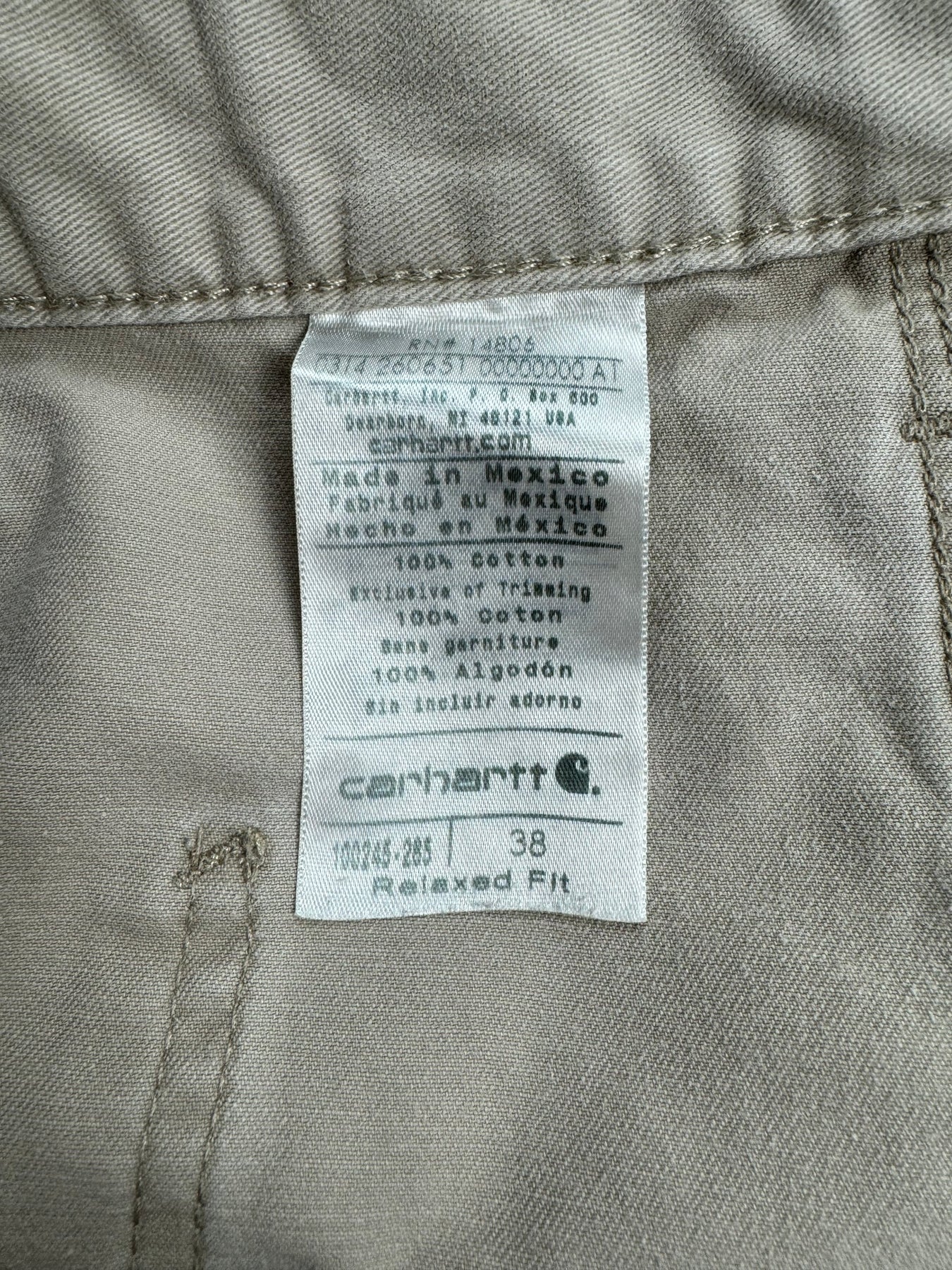 Carhartt chino shorts in a relaxed fit with a waist size of 38. Made from 100% cotton for durability and comfort. Features include multiple pockets and belt loops, ideal for casual wear. See damage in photo.