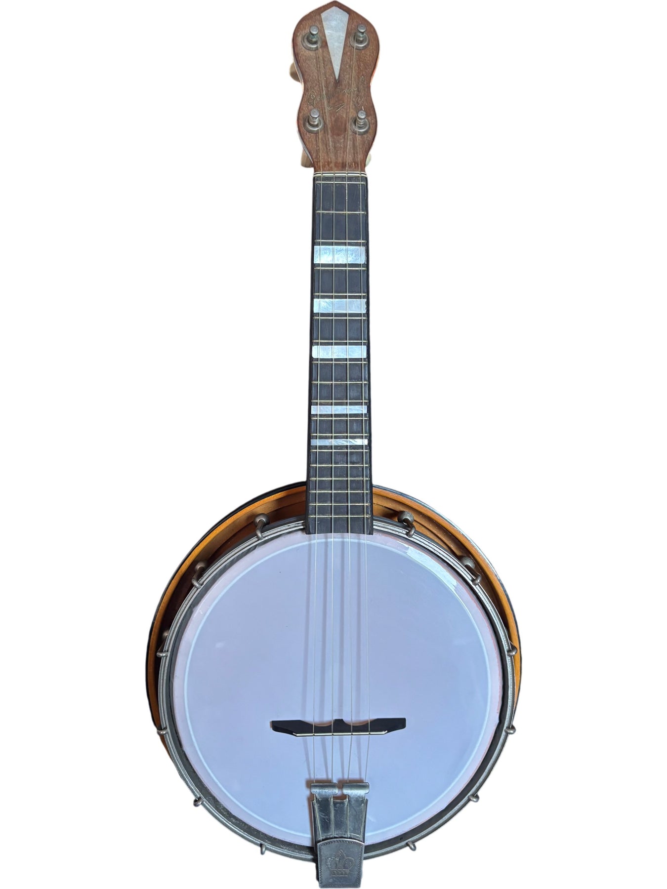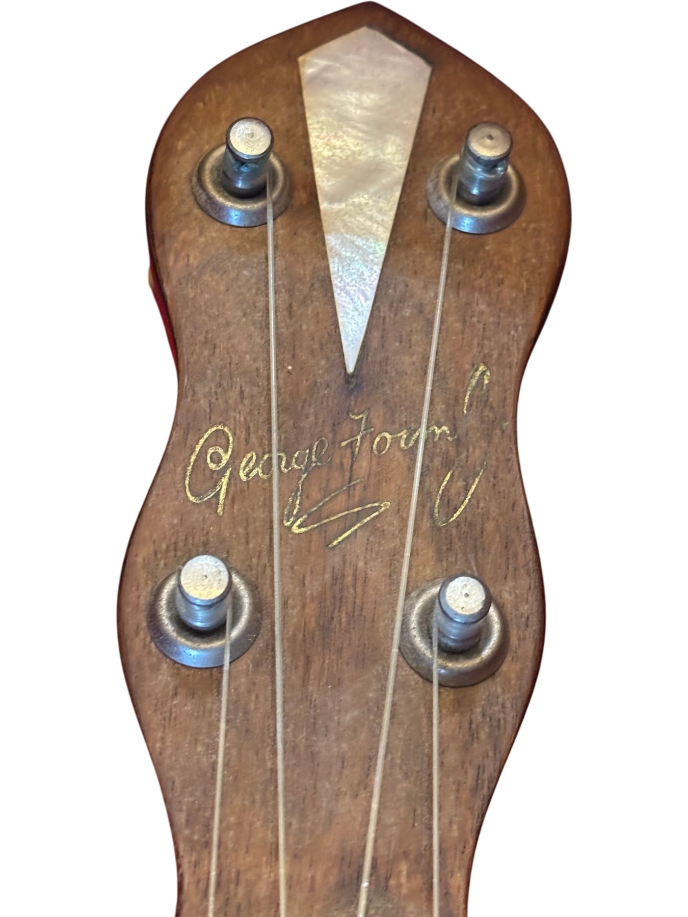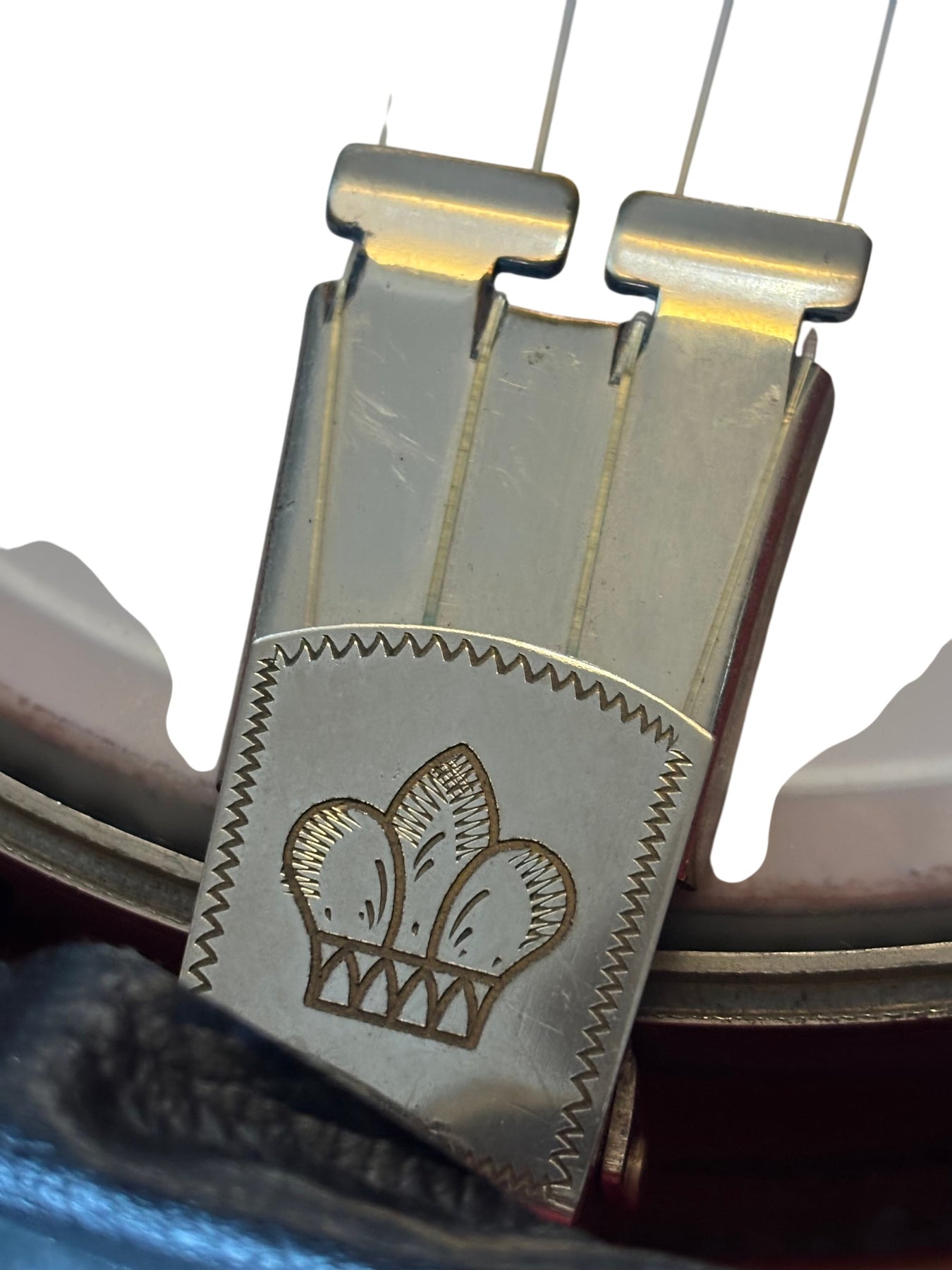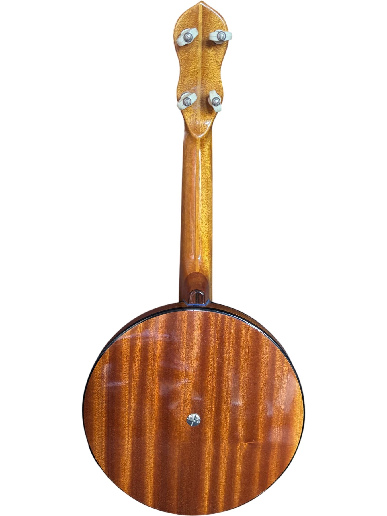 Banjo with wooden neck and resonator, featuring a metal tailpiece and a signature on the headstock. Comes with a fitted hard case for protection.