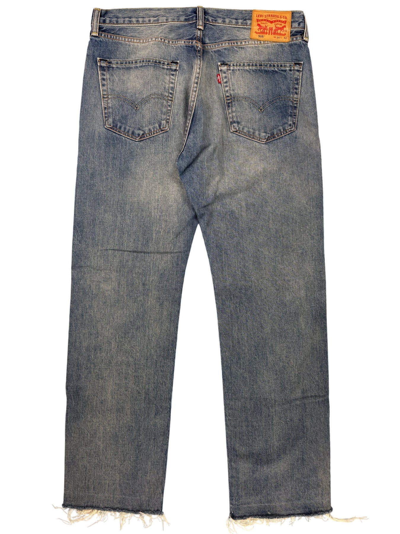 Levi Strauss 505 denim jeans with distressed detailing and raw hems. Features classic five-pocket design with branded leather patch on the back waistband.