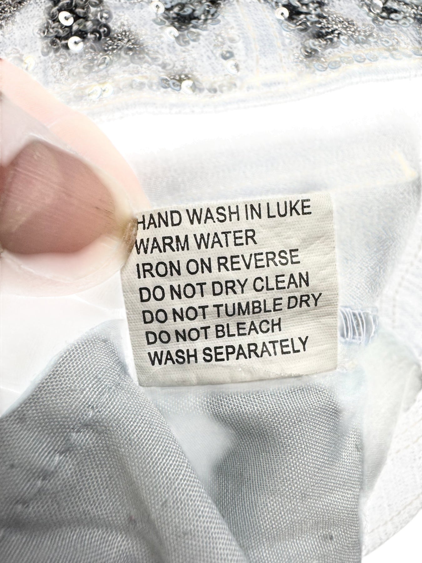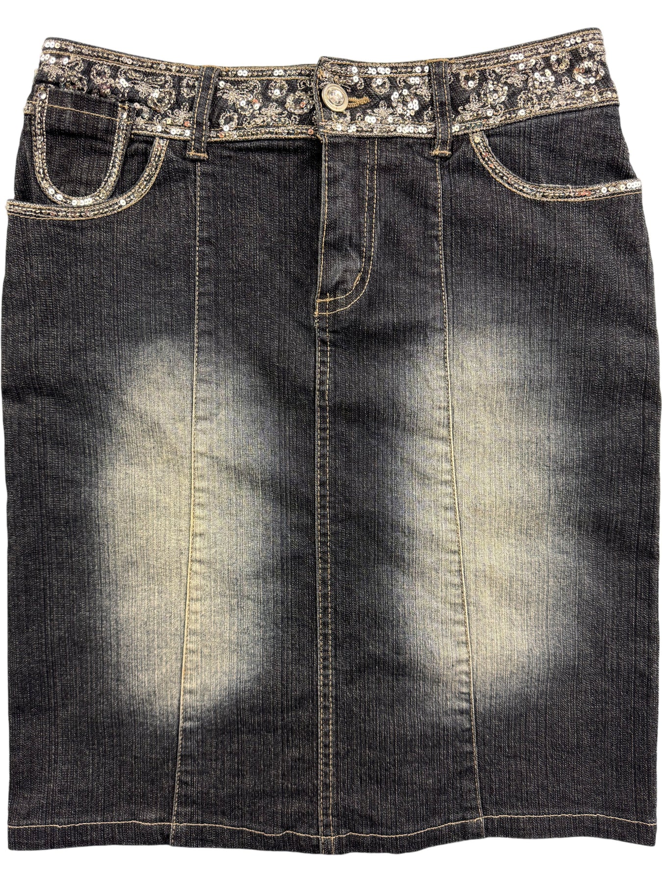 Denim skirt featuring a sequined waistband with detailed stitching. Made of 97% cotton and 3% elastane for flexibility and comfort. Includes front and back pockets with decorative sequined trim.