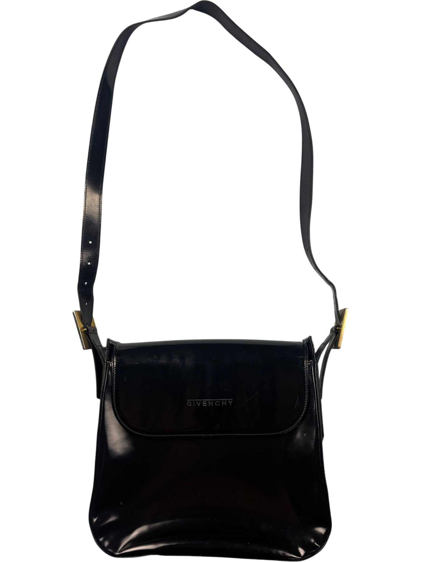Black crossbody bag by Givenchy with a sleek design. Features a flap closure and adjustable strap. Made from high-quality leather. Some slight scuffing, not noticeable when worn.