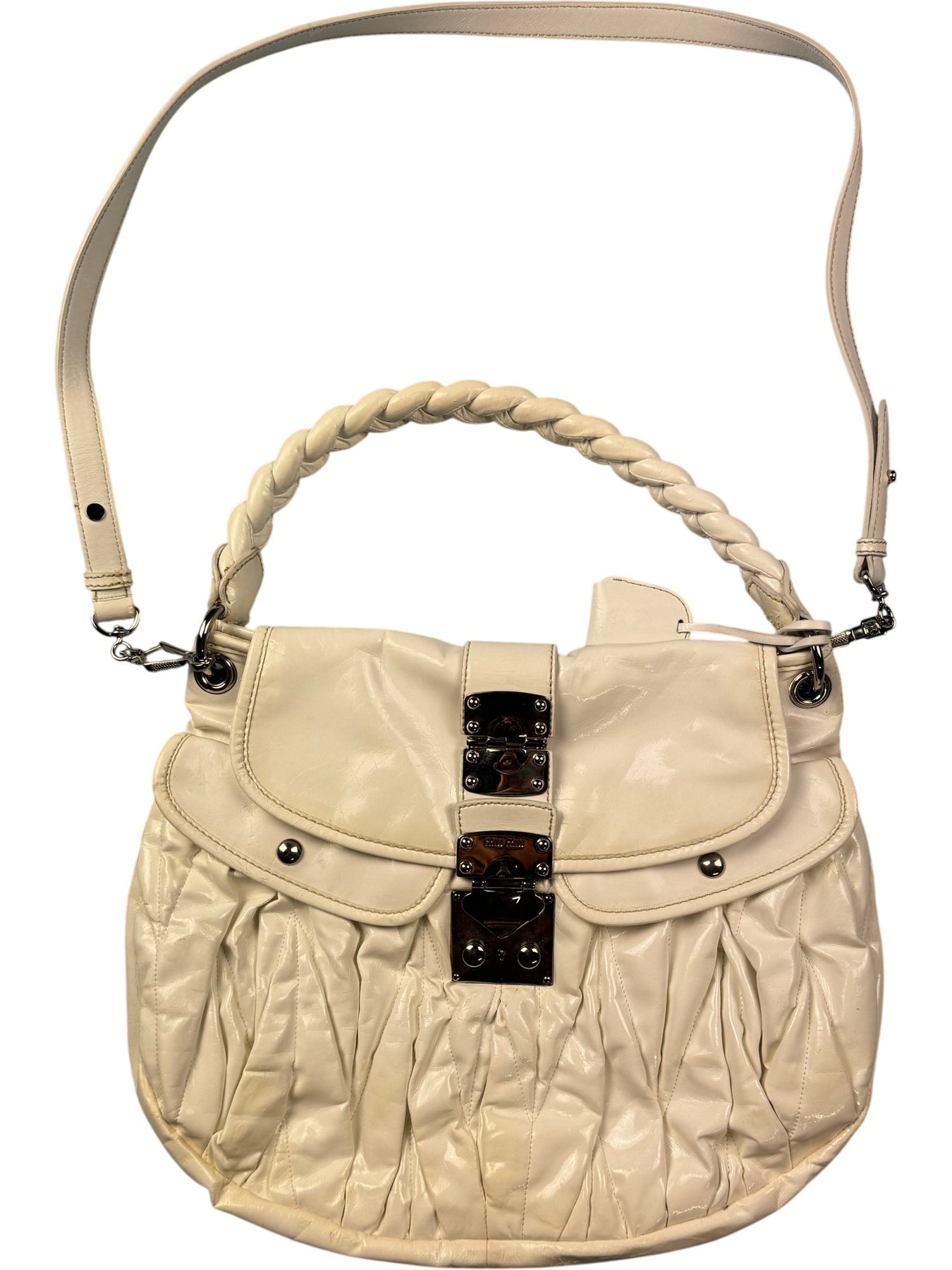This Miu Miu shoulder bag features a braided handle and an adjustable strap for versatile carrying options. It has a glossy white exterior with pleated details and a metal push lock closure for a stylish finish.