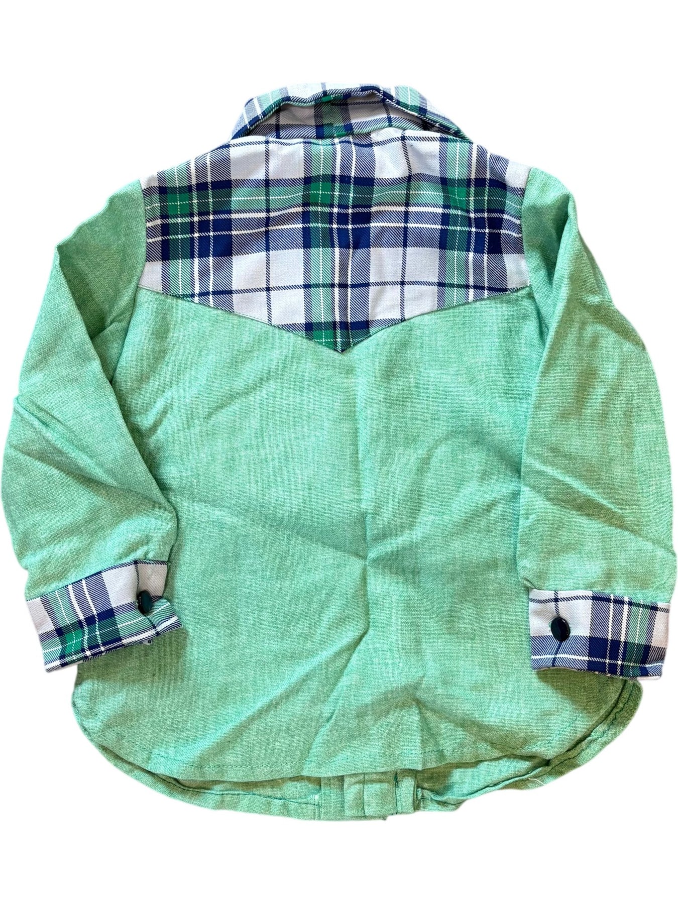 Green baby shirt with plaid pattern on collar and shoulders. Features button closure and plaid cuffs. Made from a cotton blend fabric.