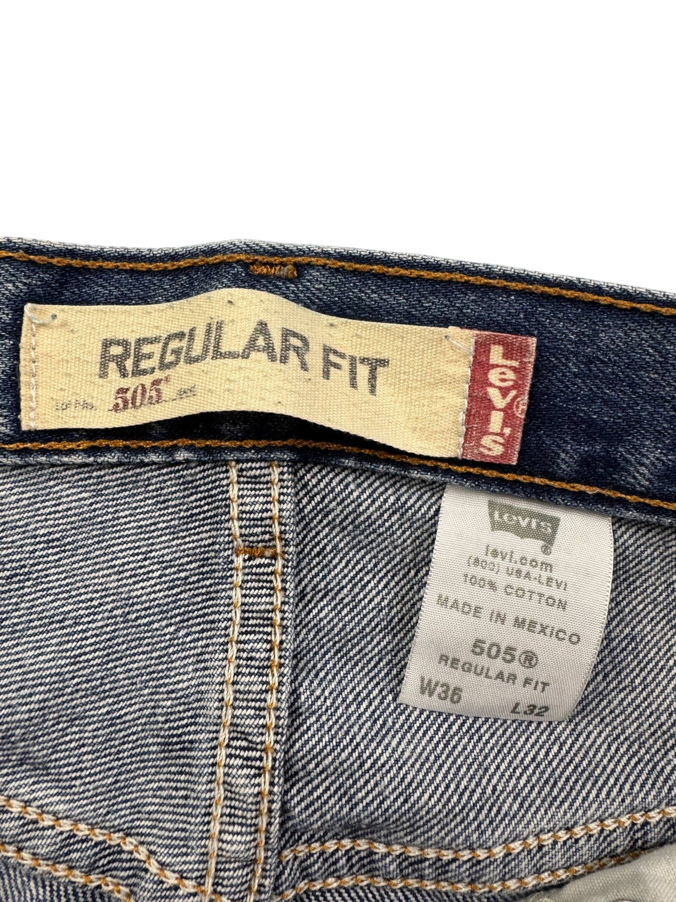 Levi 505 regular fit denim jeans made from 100% cotton. Features classic five-pocket styling and a zip fly. Medium wash with riveted pockets for durability. Made in Mexico.