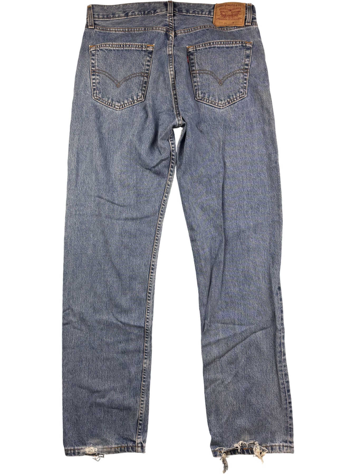 Classic Levi jeans with a straight leg design and a stone wash finish. Features include a traditional five-pocket style, button fly, and signature Levi's branding at the back.