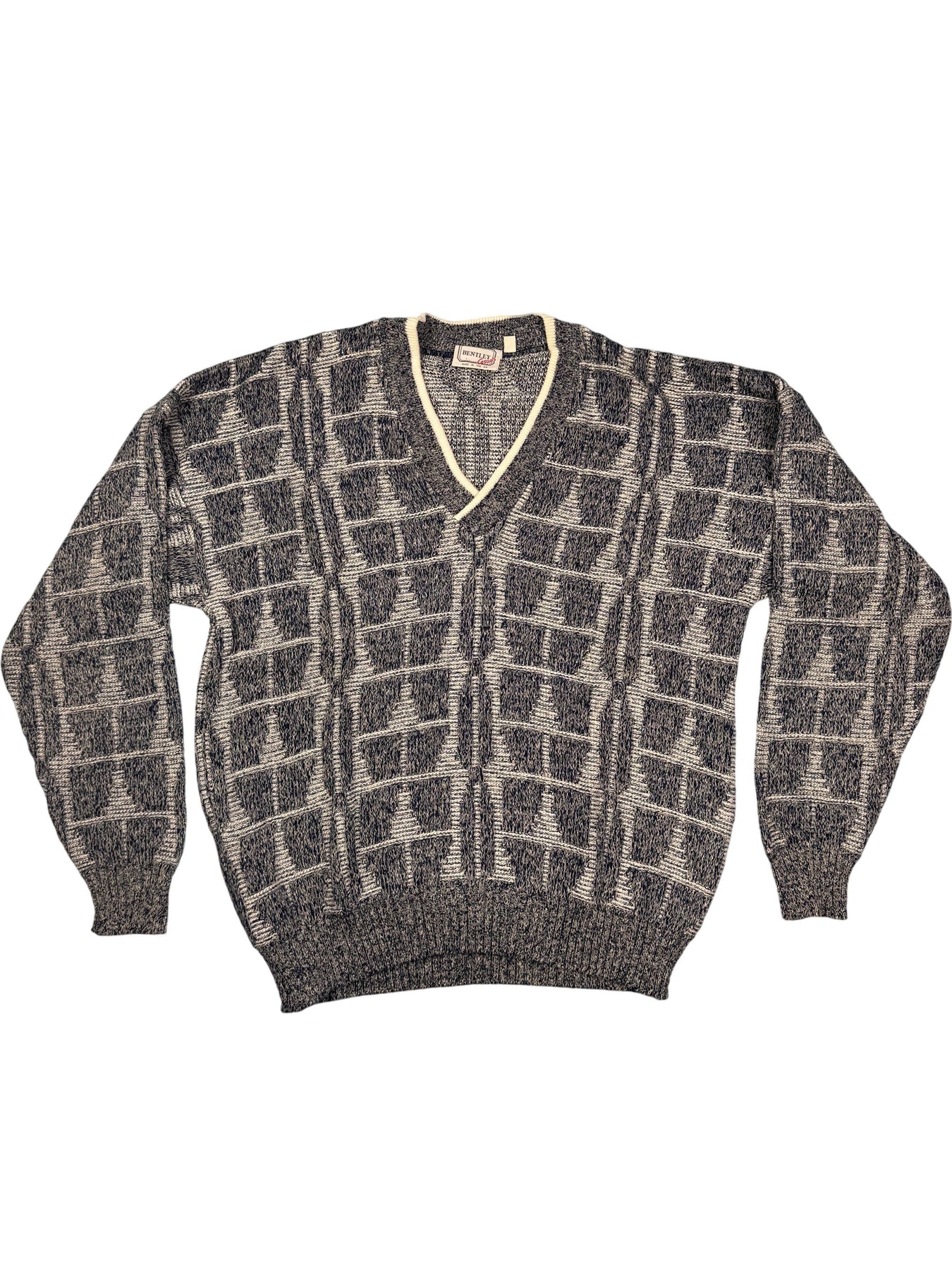Bentley Casuals sweater featuring a geometric pattern. Made in the U.K. with a blend of acrylic, cotton, and nylon. V-neck design with ribbed cuffs and hem.
