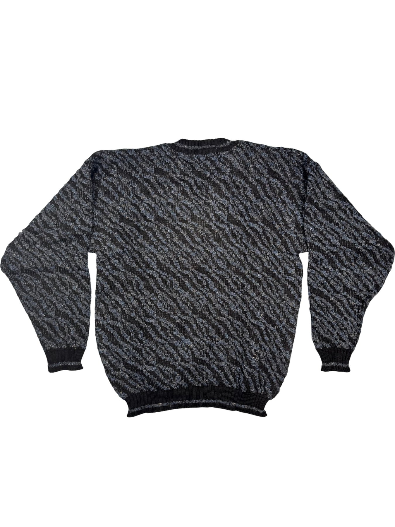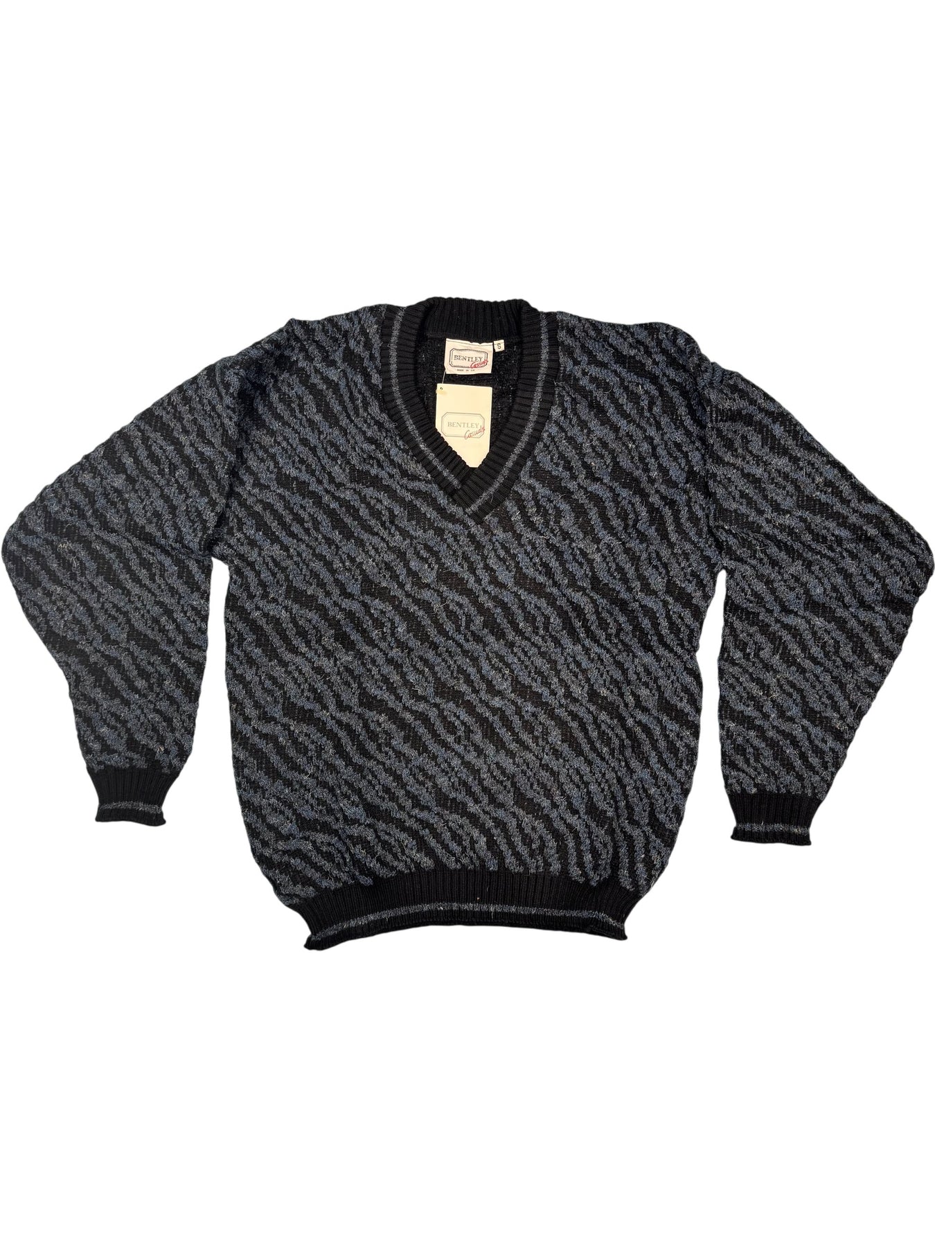 Black and gray patterned sweater with V-neckline. Made by Bentley Casuals in the U.K. Features ribbed cuffs and hem.