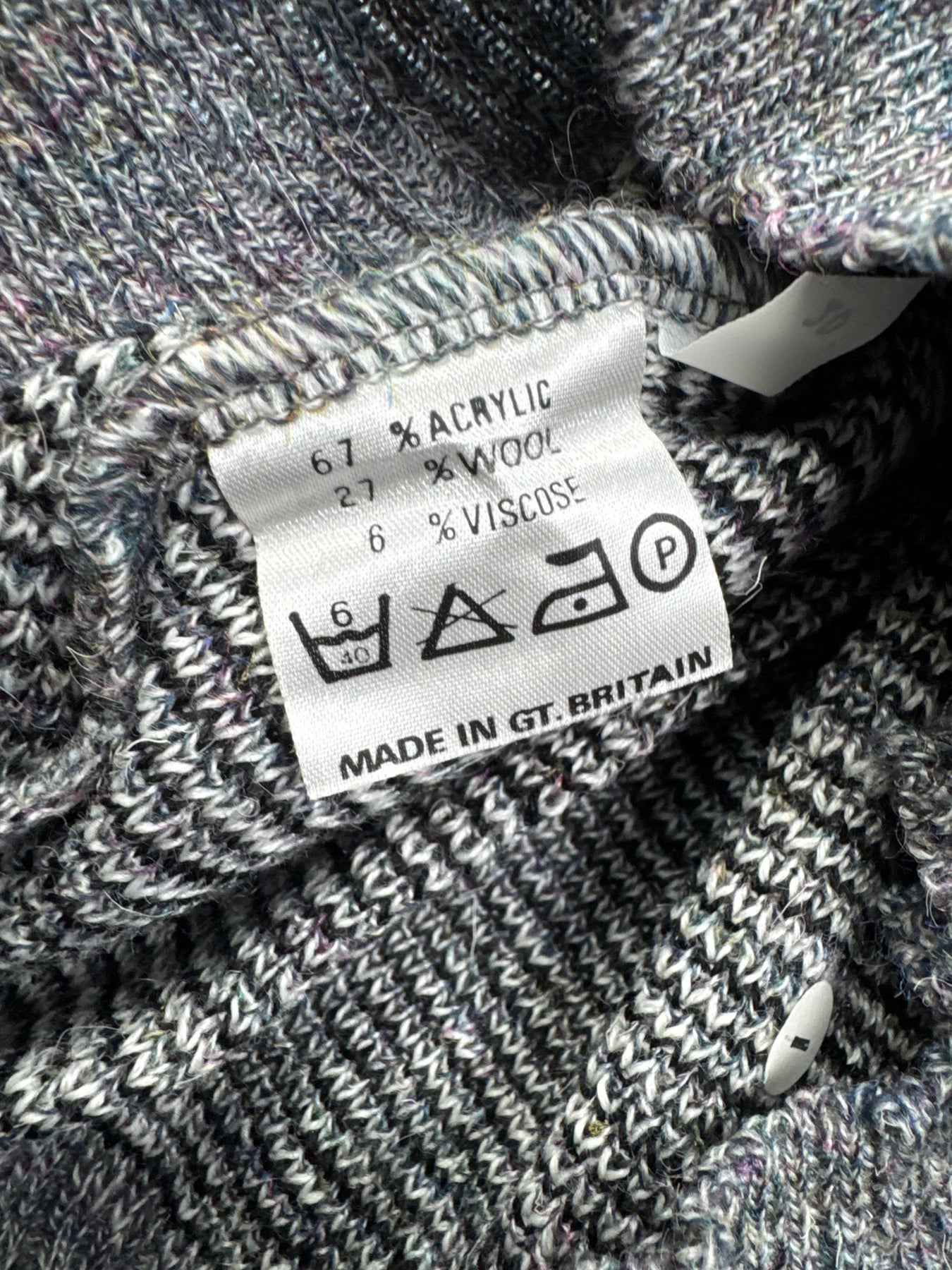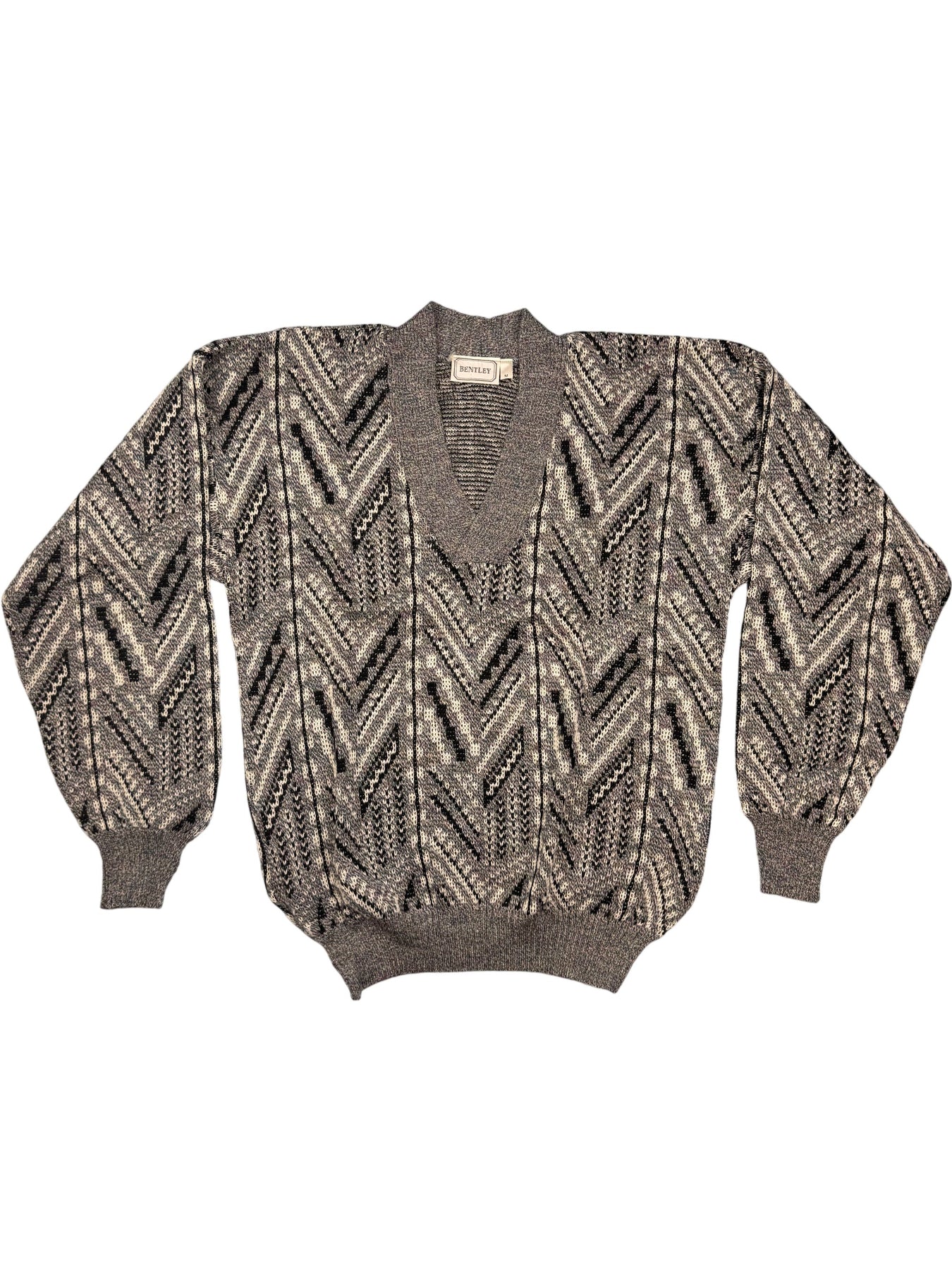 Bentley branded sweater with a geometric pattern. Composed of 67% acrylic, 27% wool, and 6% viscose. Features a V-neck and made in Great Britain.