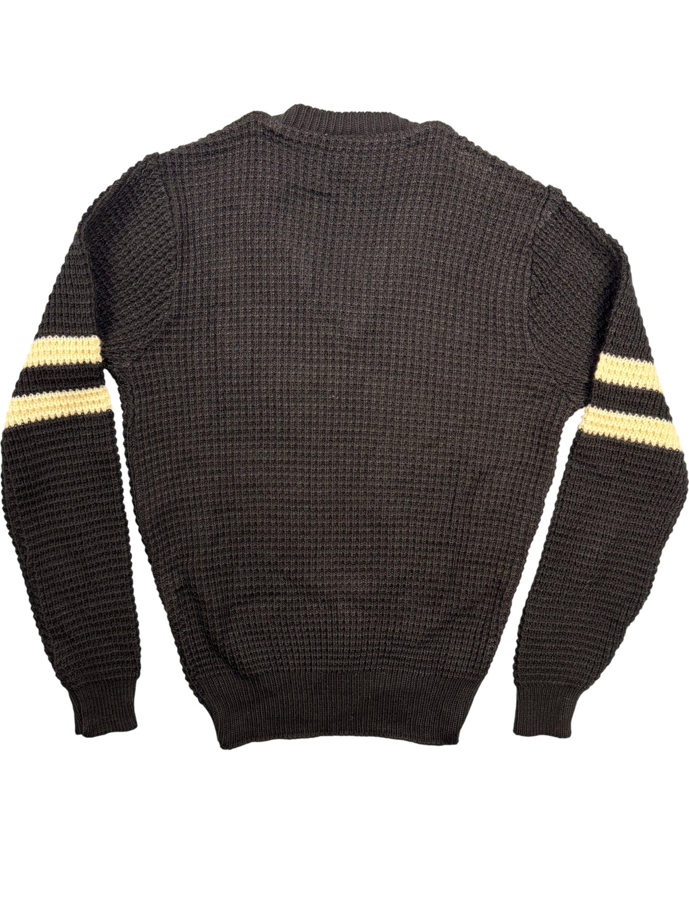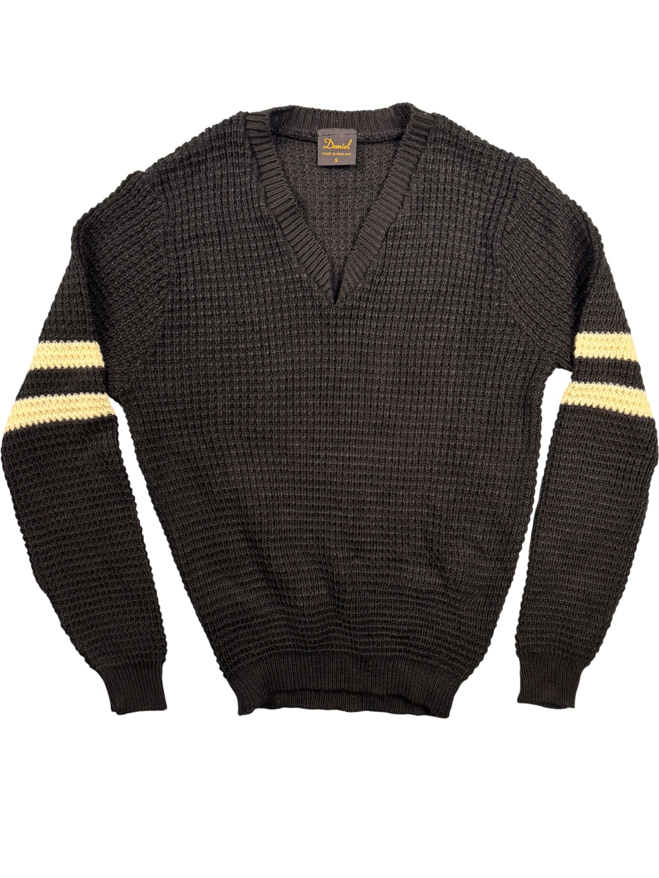 Black V-neck sweater made from 100% acrylic. Features ribbed cuffs and hem with two white stripes on each sleeve. Made in England. Size Small.