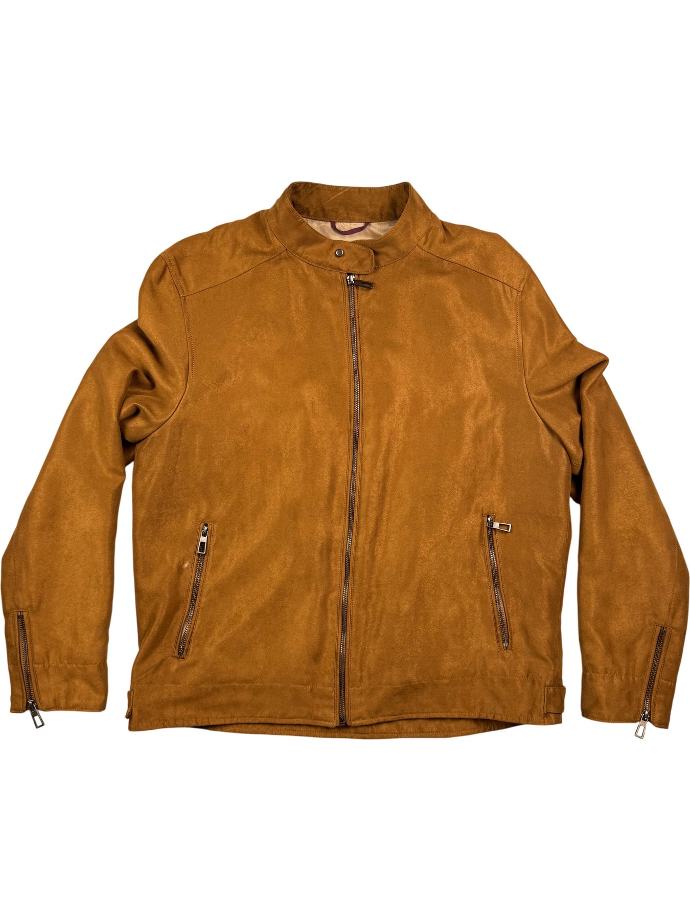 Tan faux suede jacket with a front zip closure, two front zip pockets, and a stand-up collar. Made from 100% polyester with a matching polyester lining. It features zipped cuffs for adjustable fit.