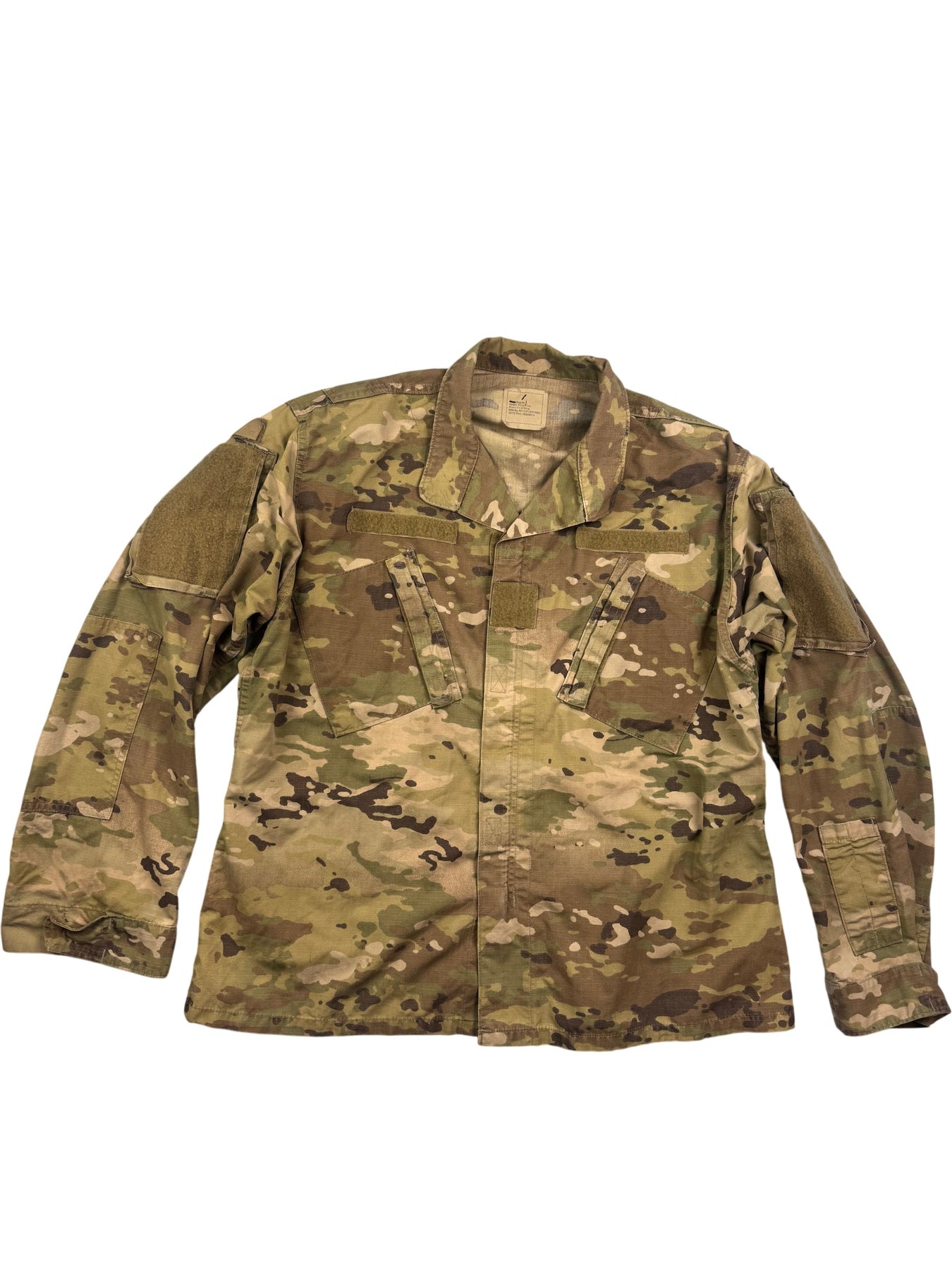 Camouflage pattern with long sleeves and multiple pockets. Features durable material suitable for outdoor activities.