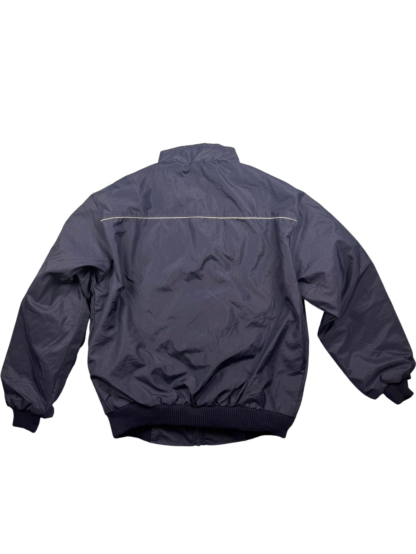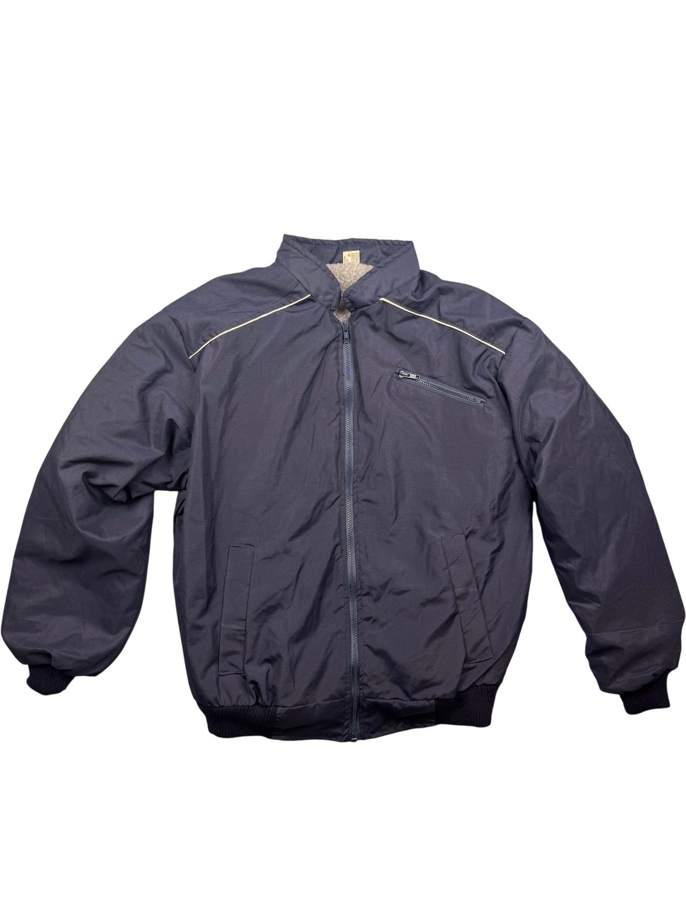 Navy bomber jacket with white piping detail. Features zip closure, front zip pocket, and side pockets. Made from a polyester and cotton blend with a cosy fleece lining. Made in Britain.