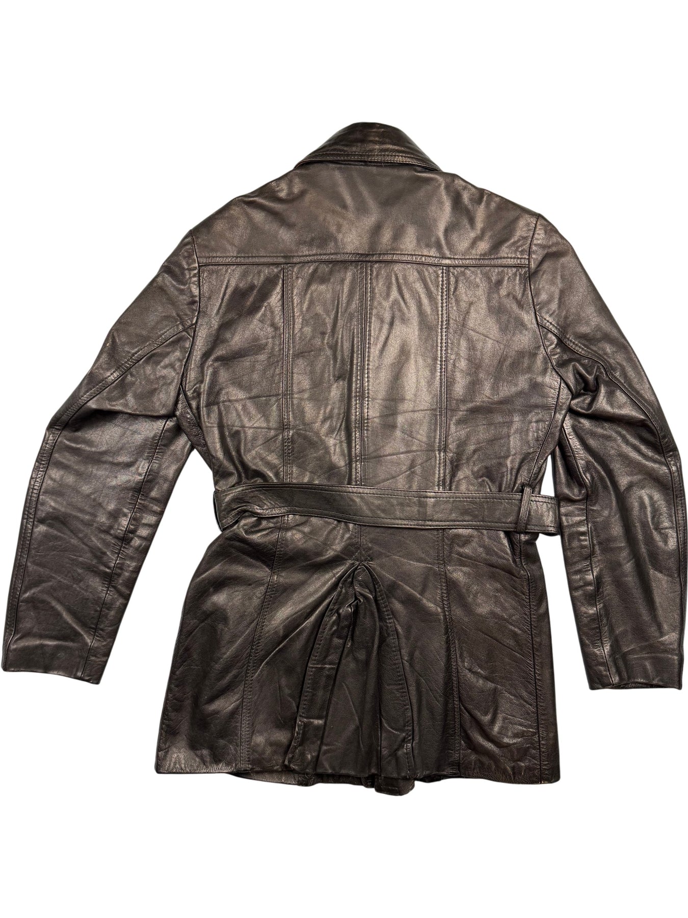 Genuine leather jacket with thick collar and button closure. Features two large front pockets and an adjustable belt for a tailored fit.