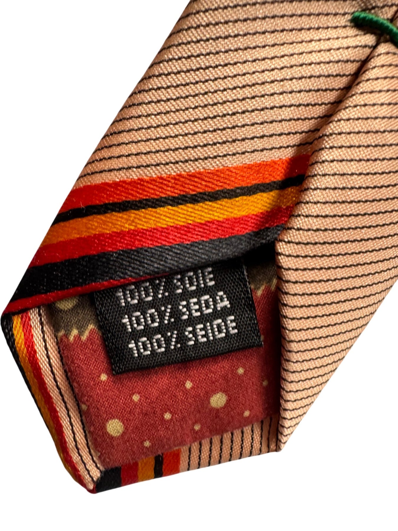 This tie is crafted from 100% silk, providing a luxurious texture and finish. It features a striking diagonal stripe pattern in a blend of beige, orange, red, and black tones. The tie is designed by Paul Smith, known for their distinctive style.