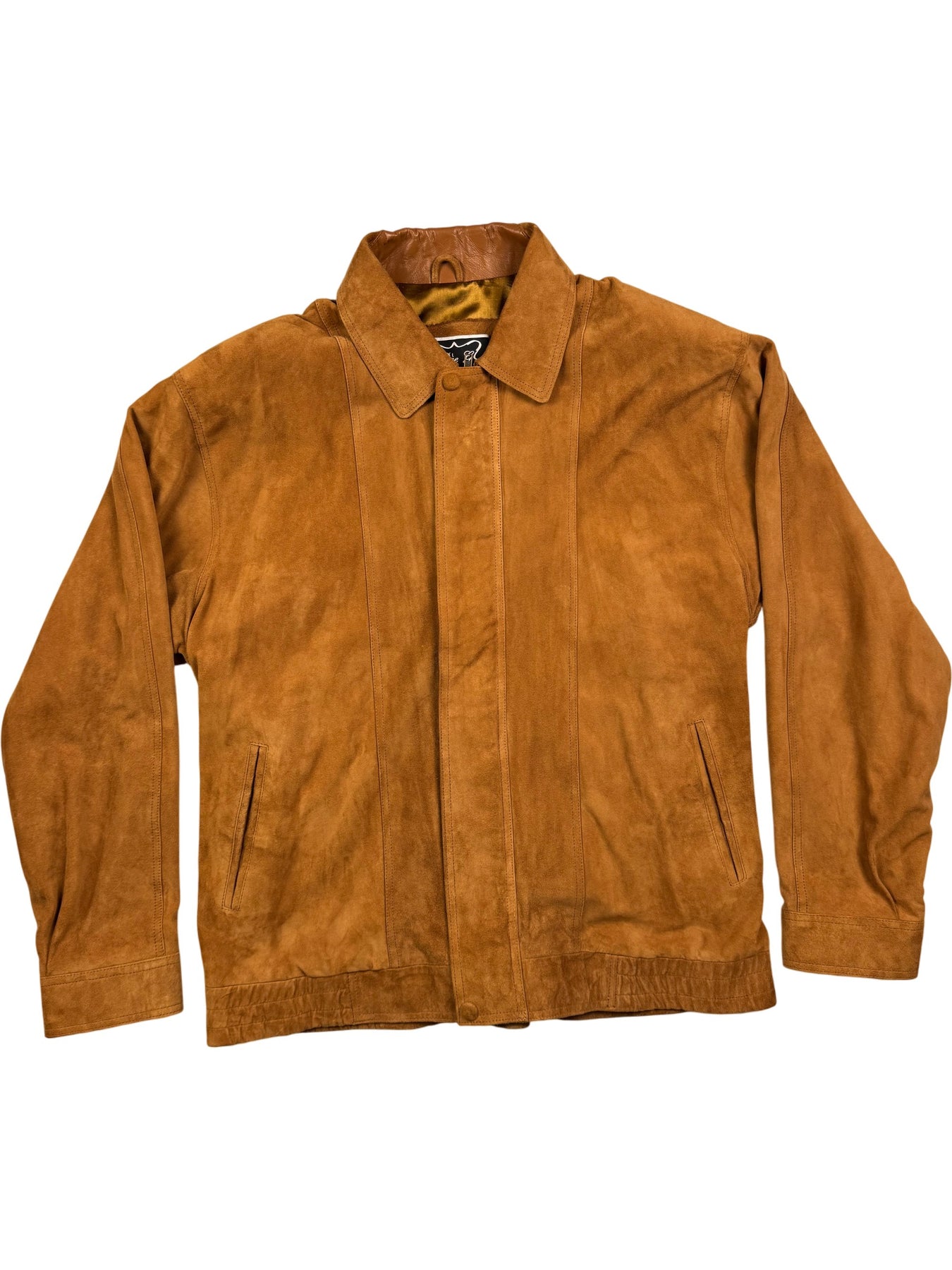 Genuine real leather jacket by Bee G featuring a front button closure. This brown suede jacket includes two front pockets and a smooth lining.