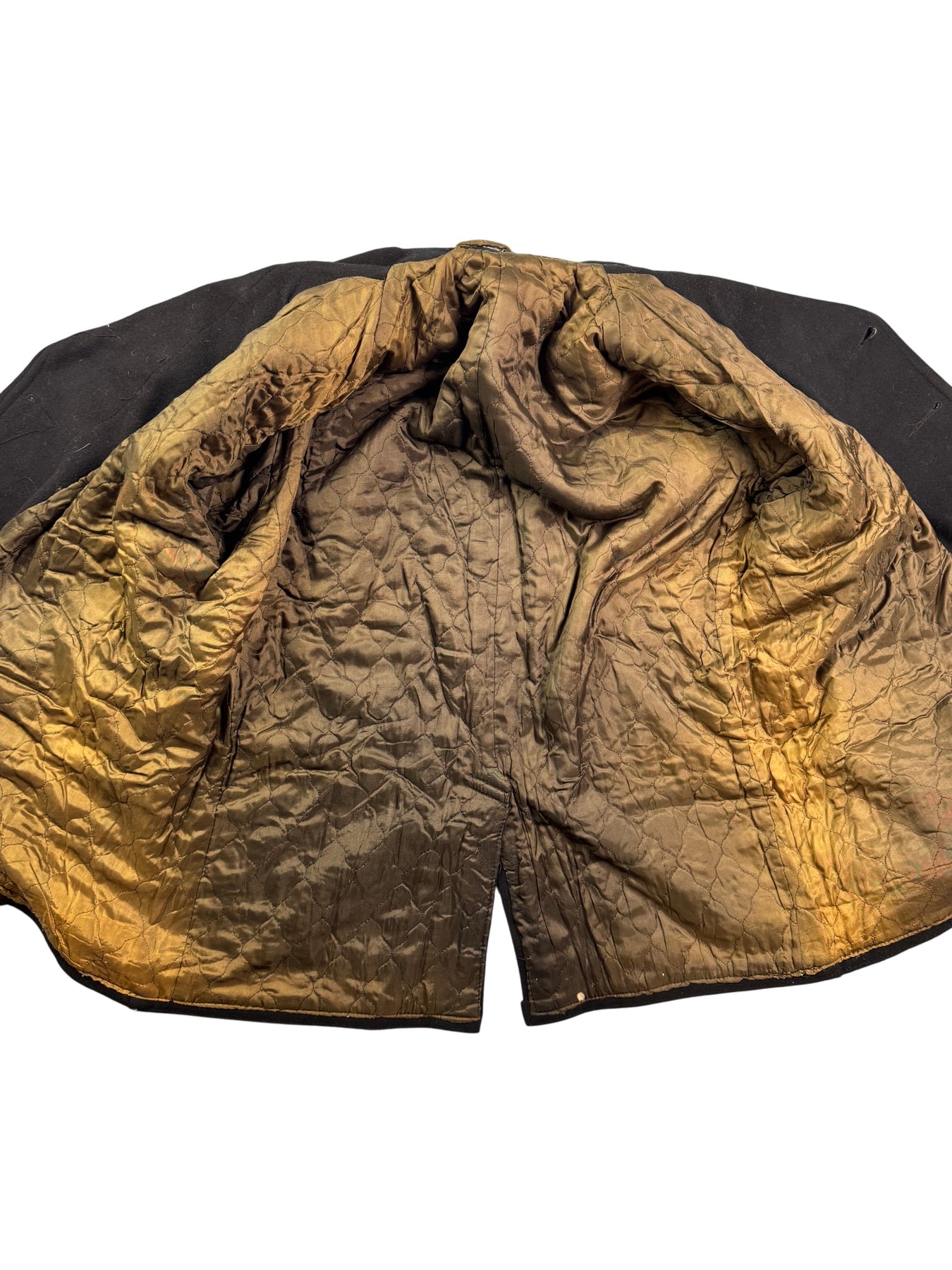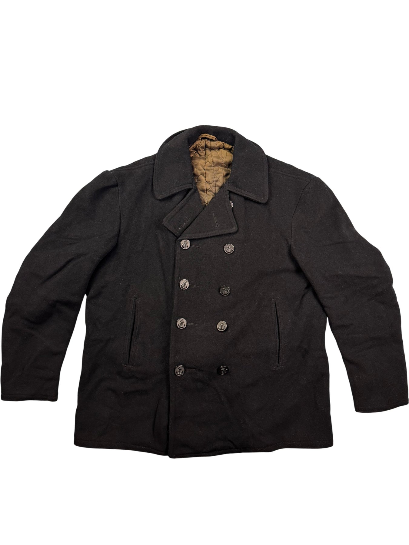 Black double-breasted pea coat with anchor-embossed buttons. Features a quilted lining and wide lapel collar. Two vertical front pockets for added functionality.