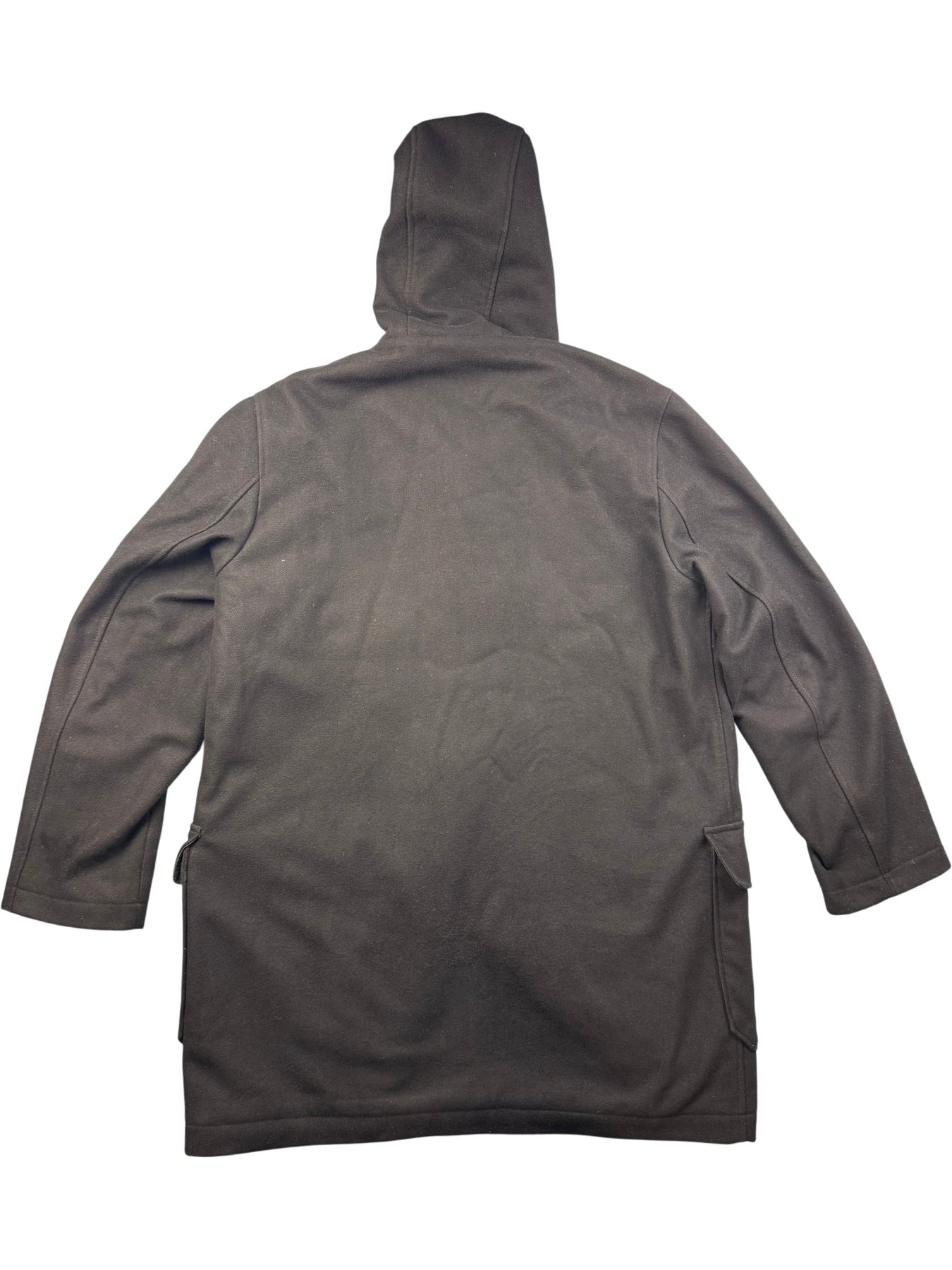Black duffle coat with toggle fastenings and two front pockets. Made of 70% wool, 10% polyamide, 10% polyester, and 10% other fibres. Hooded design with a polyester lining.
