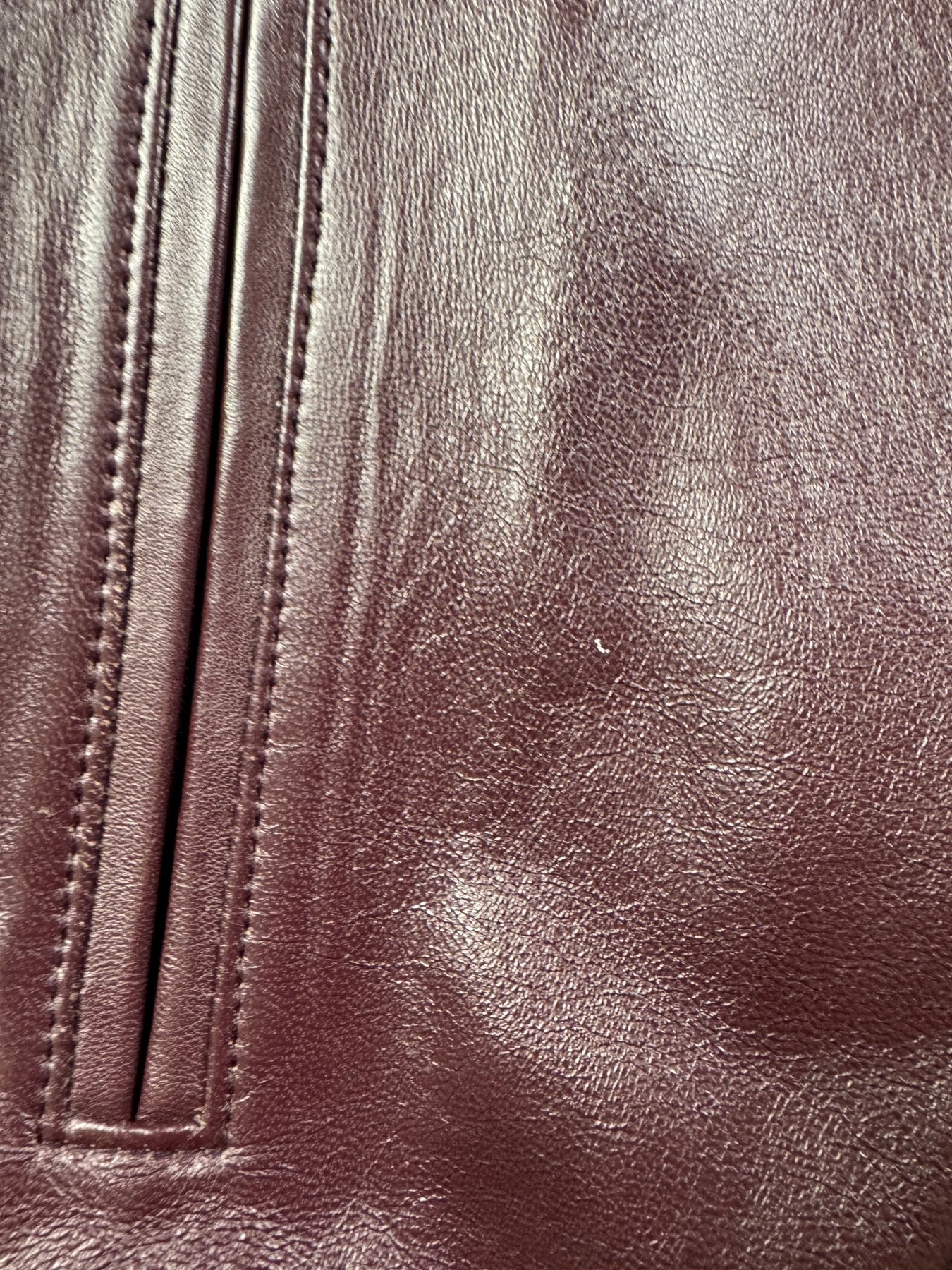 Brown leather bomber jacket with a classic collar and front zipper closure. Features two front pockets and an elasticated hem for a snug fit. Fully lined interior for added warmth.