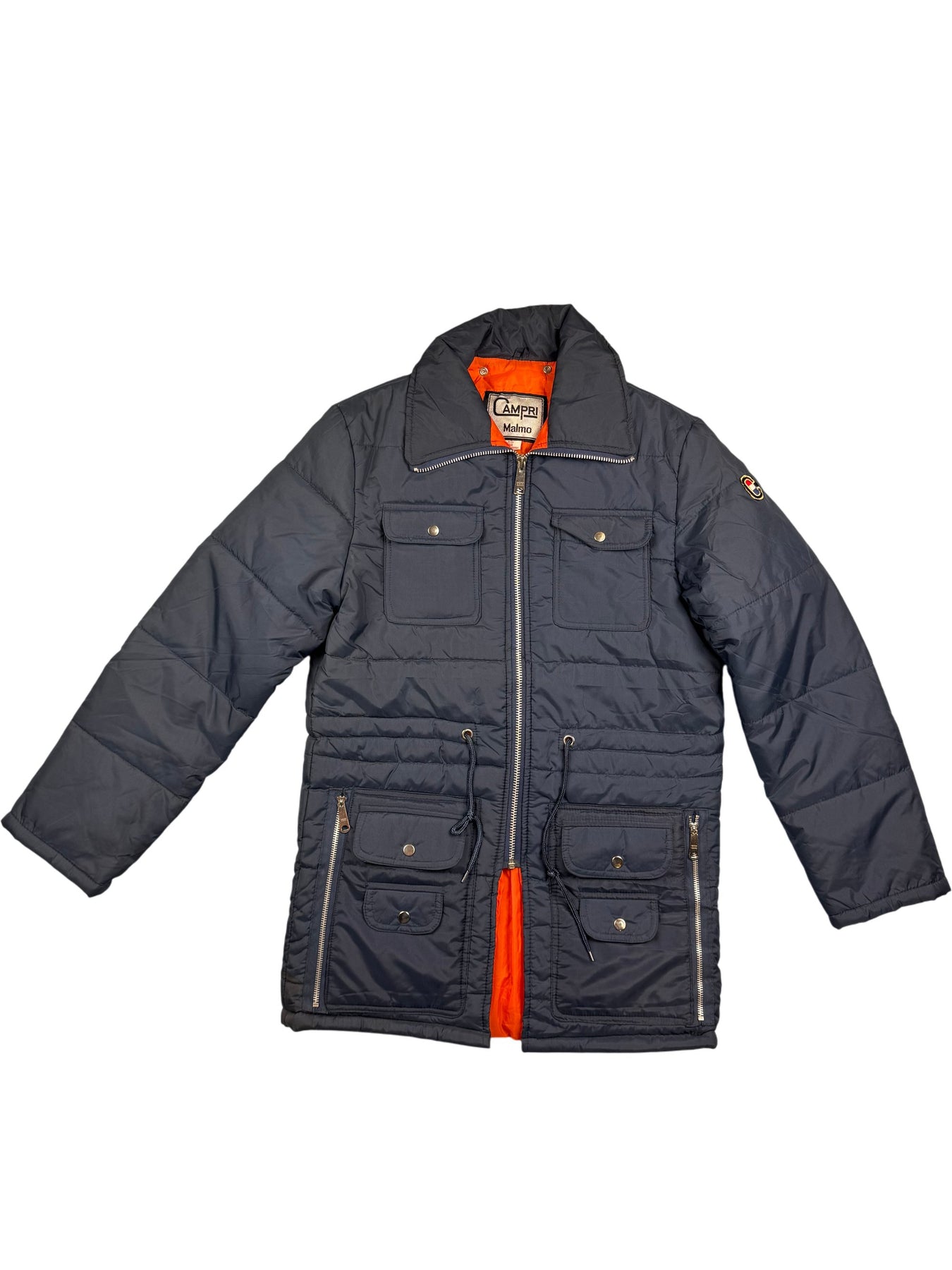 This Campri Malmo puffer jacket features a navy exterior with orange lining. It includes multiple front pockets with flap and zip closures, providing ample storage. The jacket is made in Korea with a shell and lining of nylon and a filling of polyester for warmth and durability.
