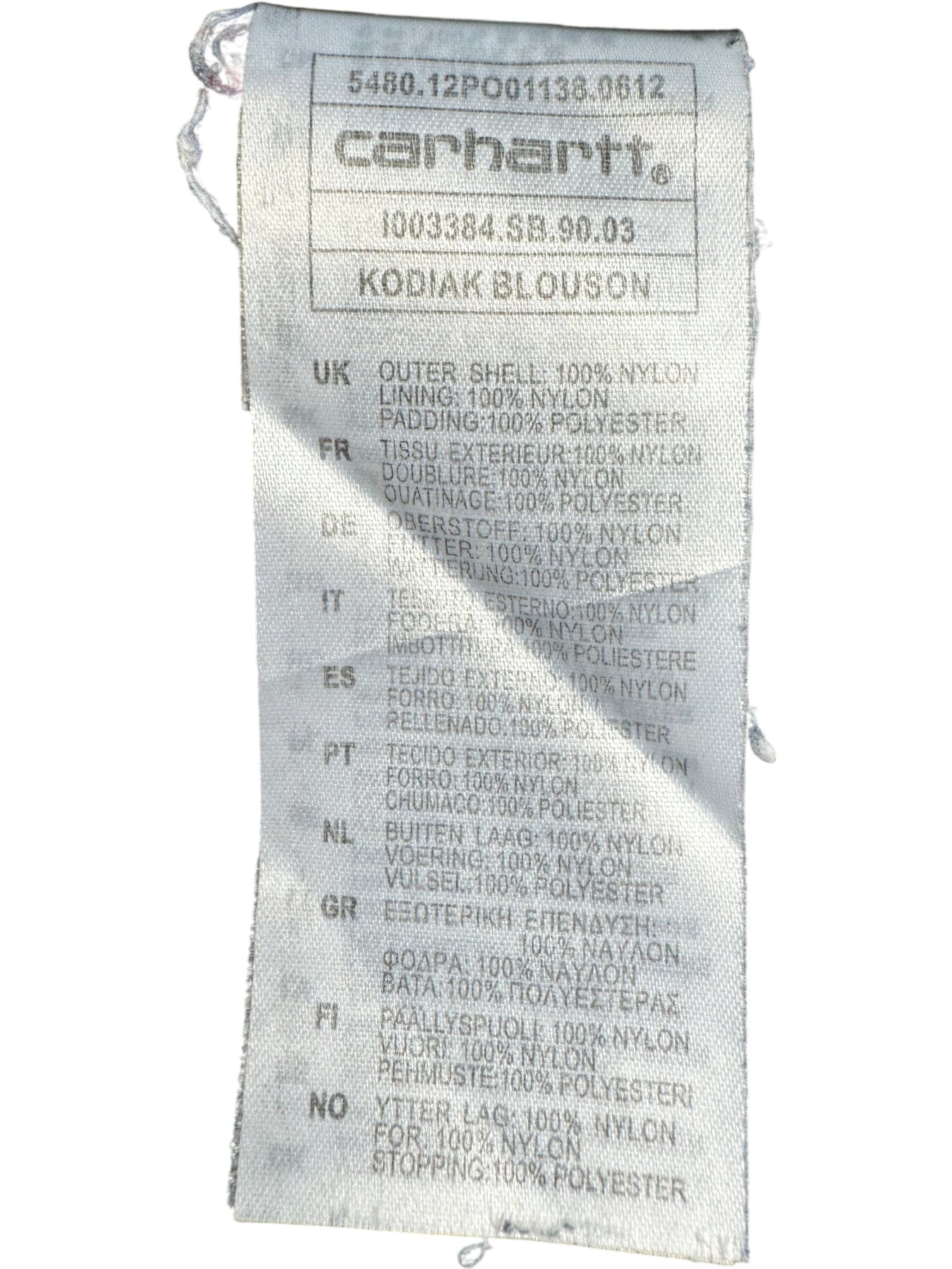 Carhartt jacket with a hood and full zip closure. Made from 100% nylon outer shell. Features a 100% polyester padded lining for warmth. Includes ribbed cuffs and hem for a secure fit.