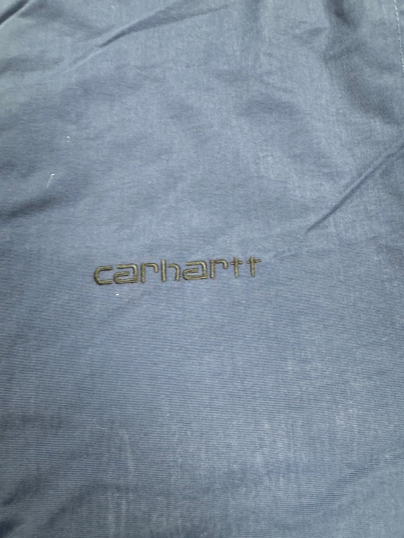 Carhartt jacket with a hood and ribbed cuffs. Made from 100% nylon with polyester padding. Features zippered front pockets and embroidered logo detail.