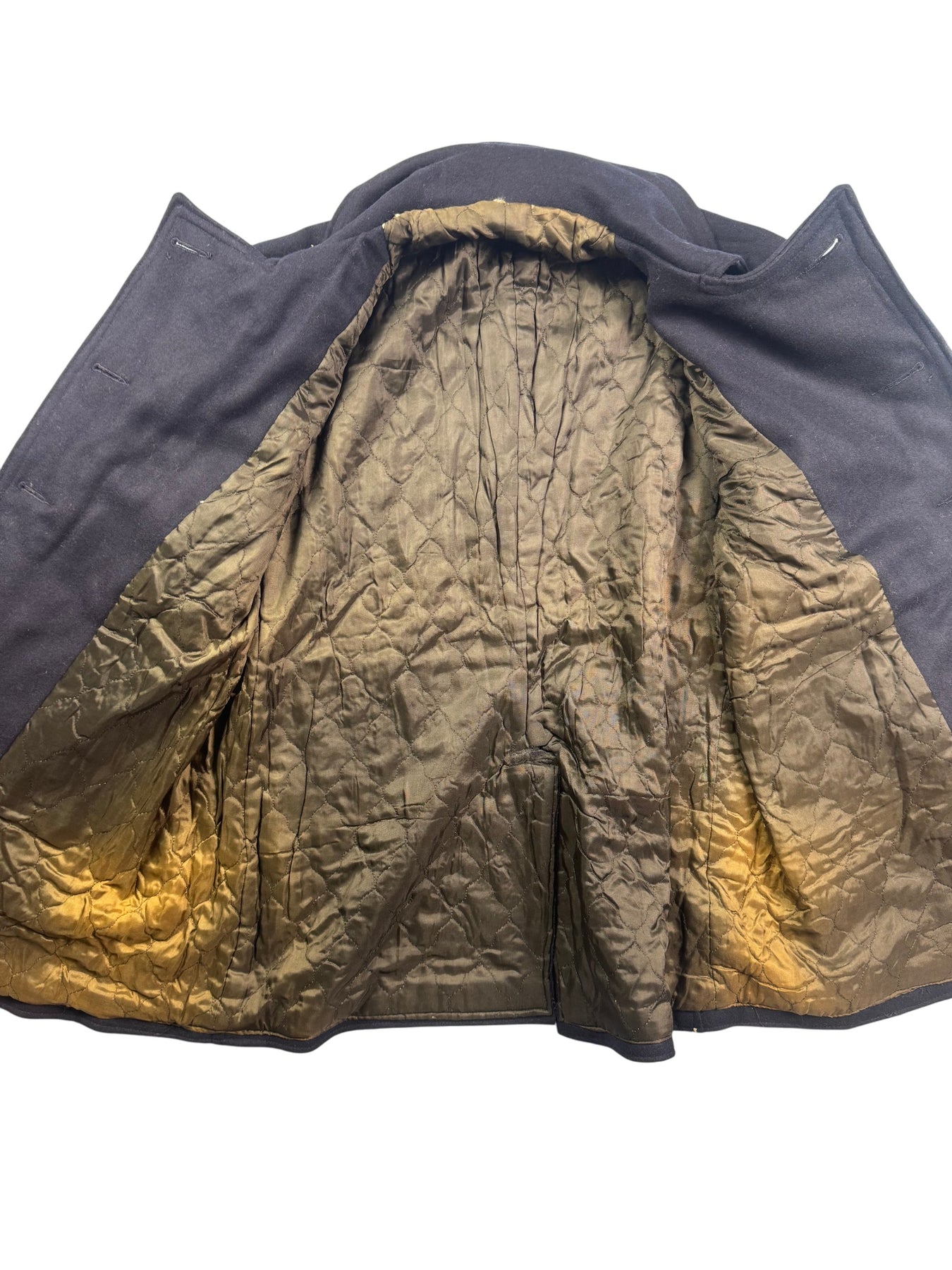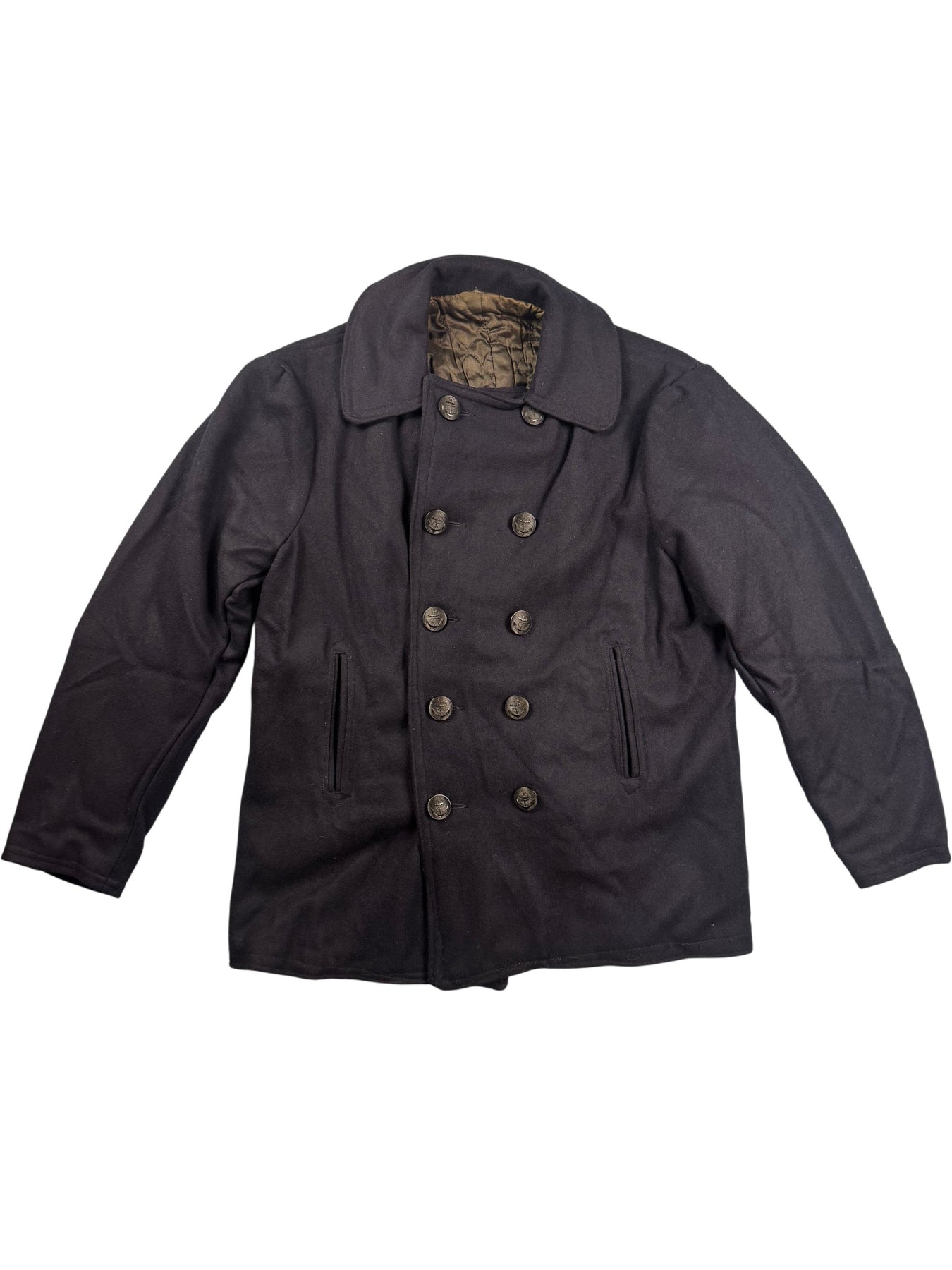 Classic black pea coat featuring a double-breasted front with crest buttons. Includes two front pockets and a quilted lining for added warmth. Traditional notched collar design.