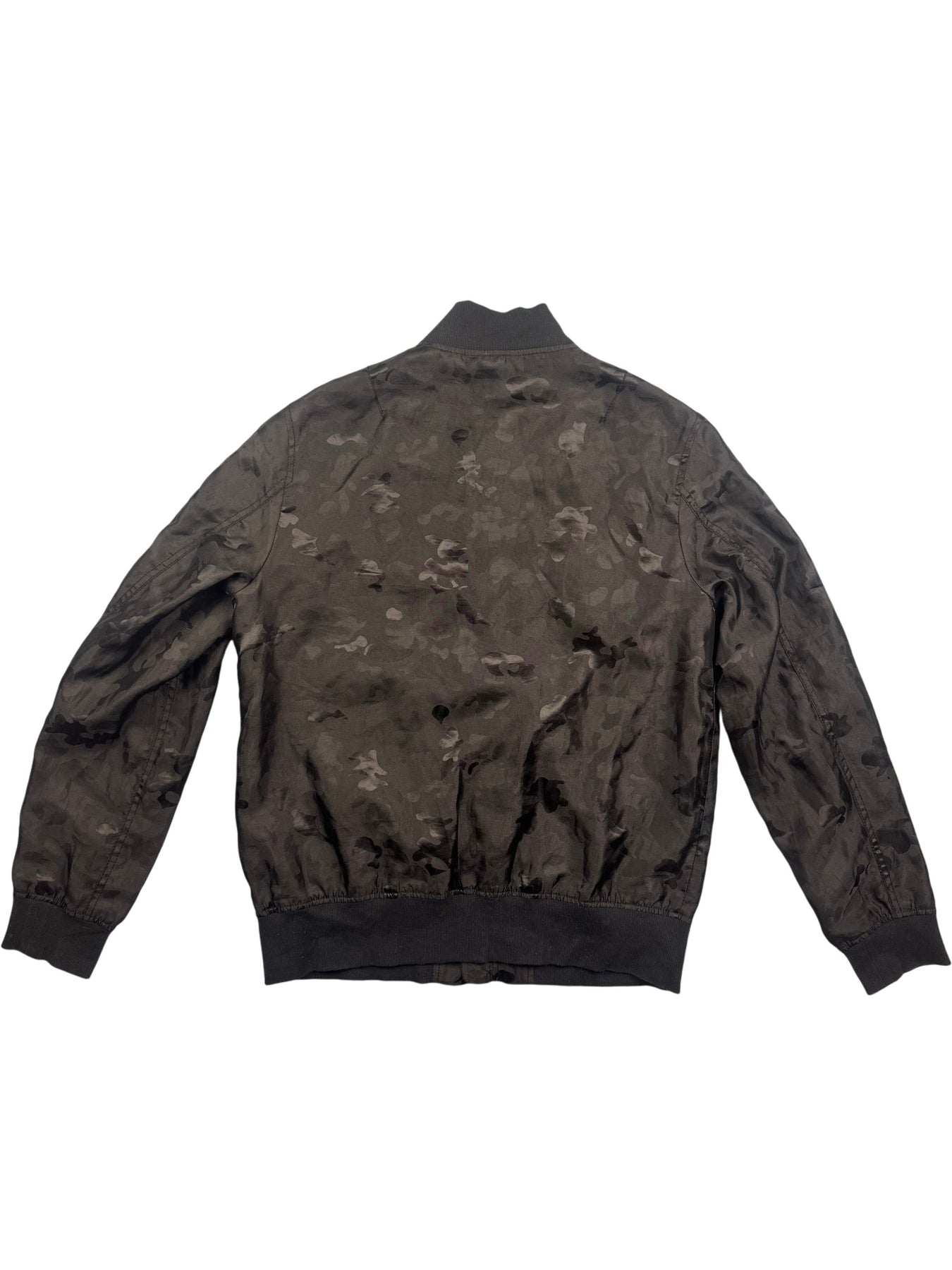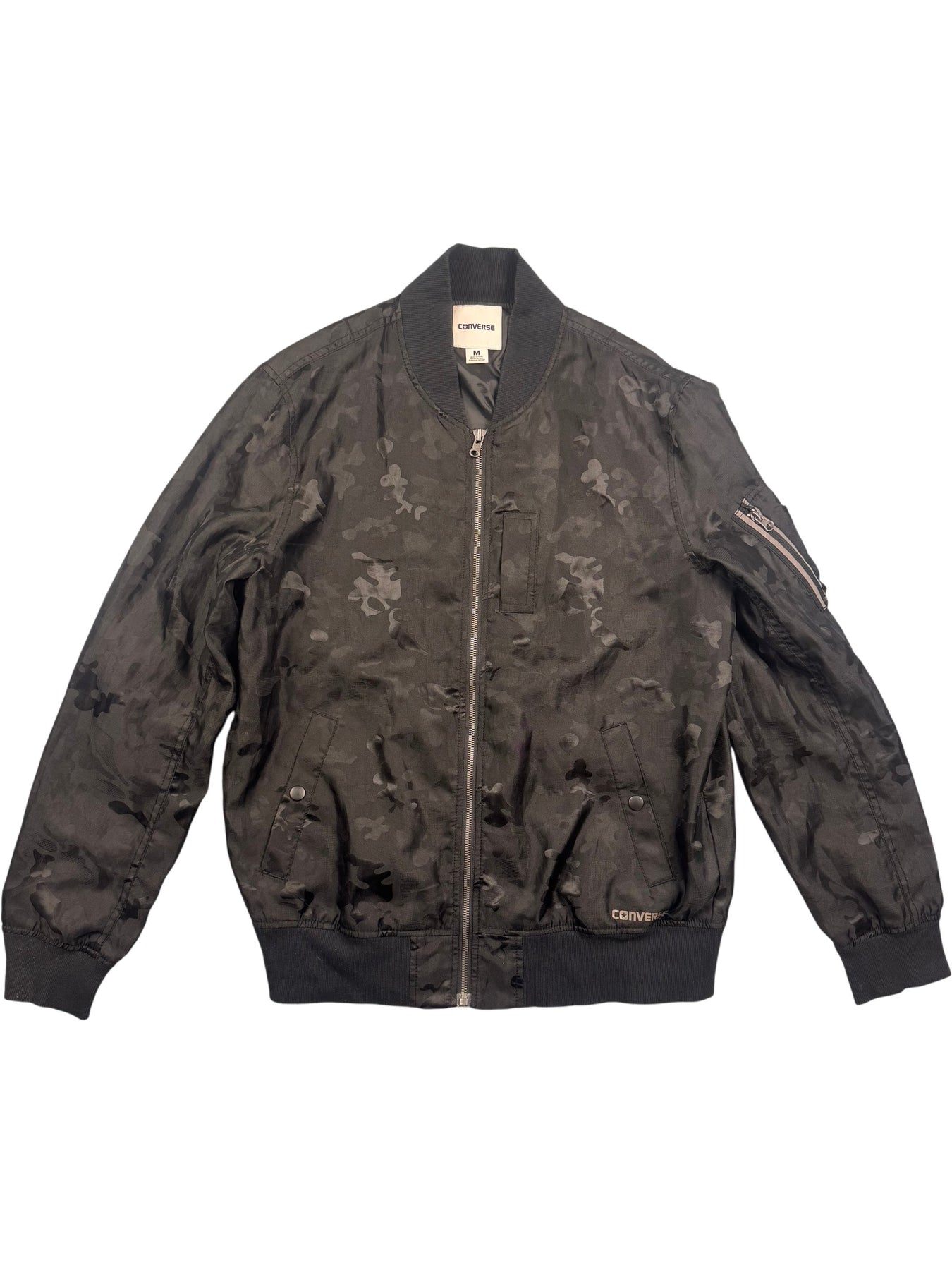 Converse bomber jacket in black with a subtle camouflage pattern. Features a front zip closure, ribbed collar, cuffs, and hem. Includes side pockets and an arm pocket with zip closure.